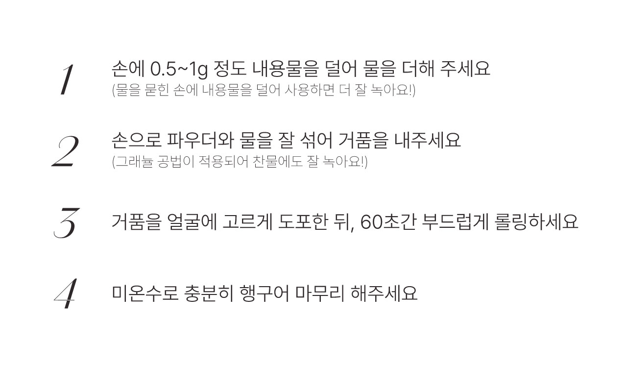 A. 데일리 세안제로 쓰실 때는 최대 1분 정도만 가볍게 두셨다가 헹궈주시면 되고, 효소팩으로 집중 관리하실 때는 3~5분 정도 그대로 두셨다가 씻어내시면 됩니다.