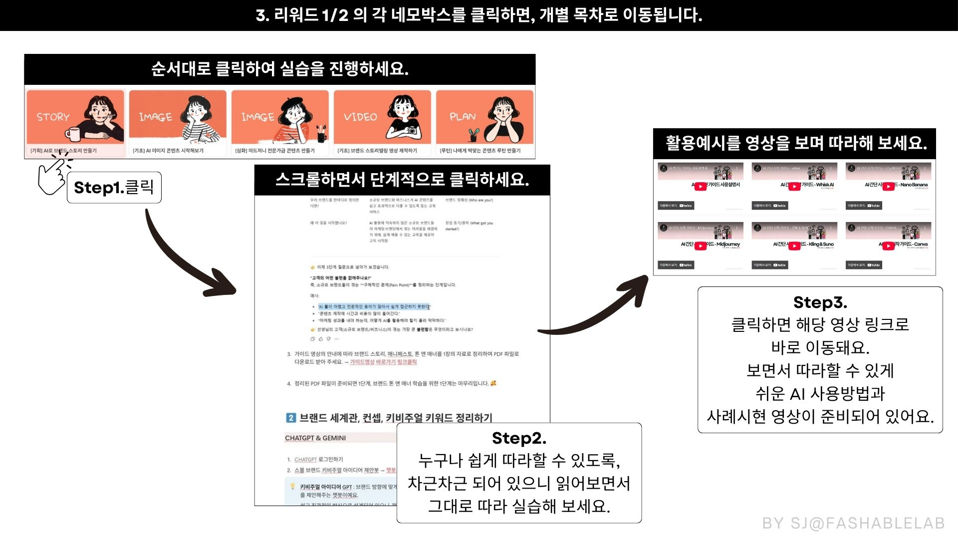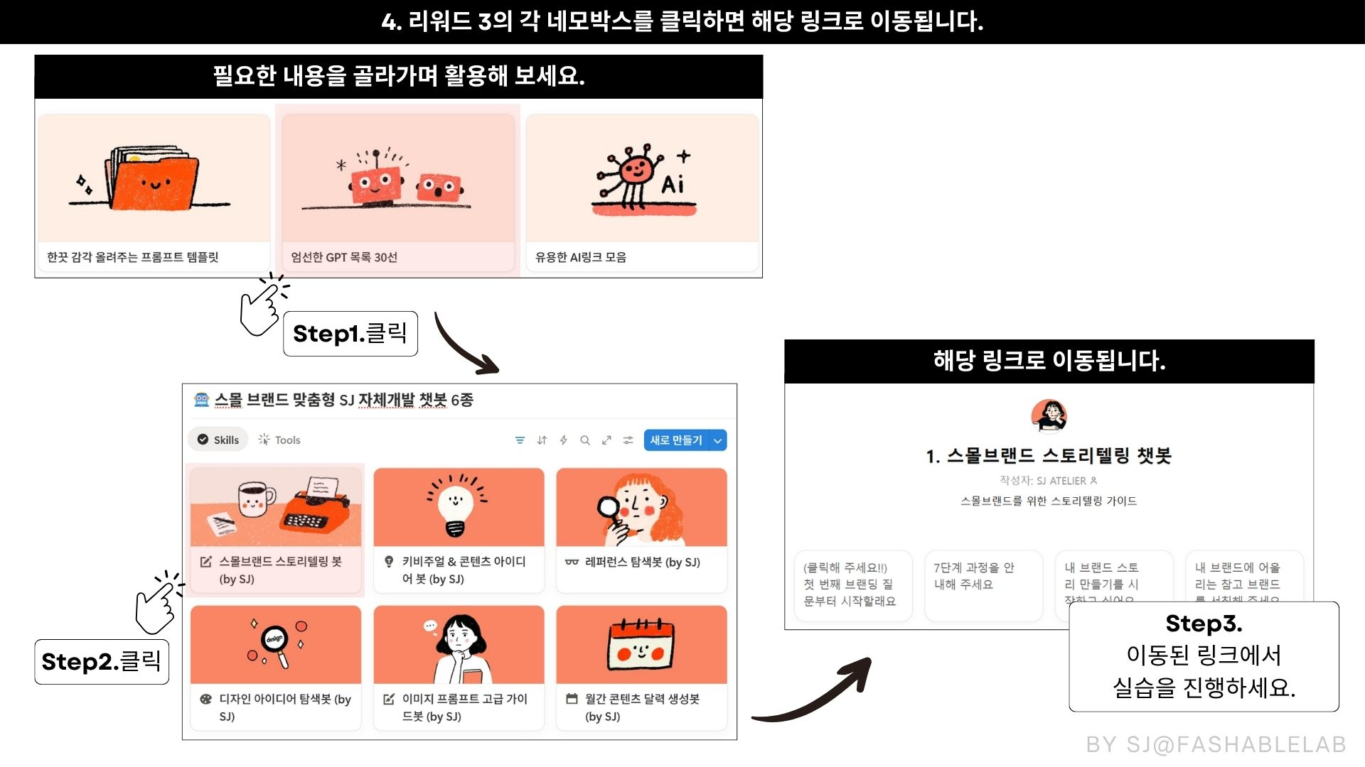 원클릭으로 누구나 쉽고 간단하게, 단계별 가이드 챗봇 링크 제공!