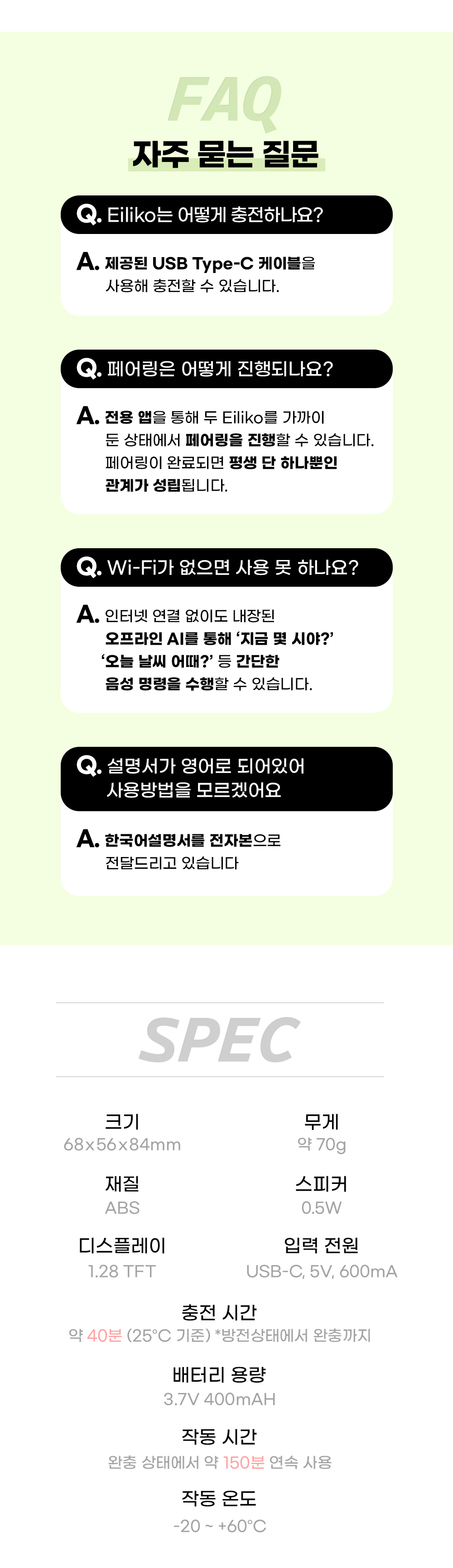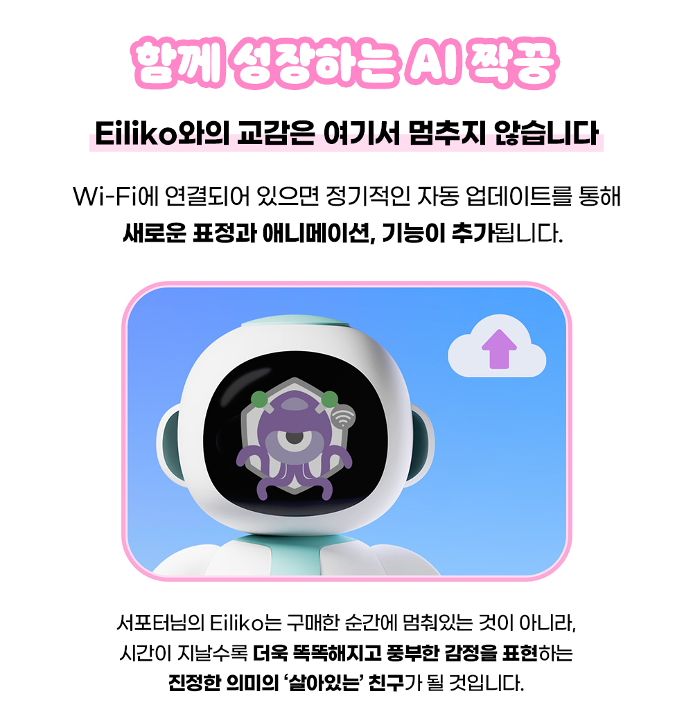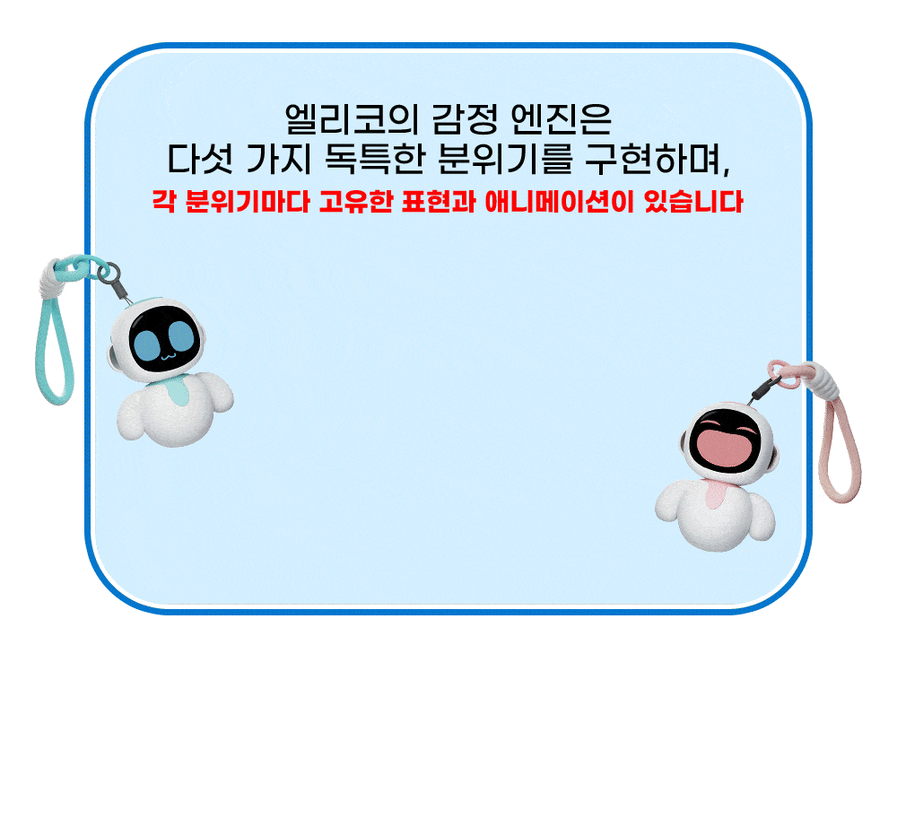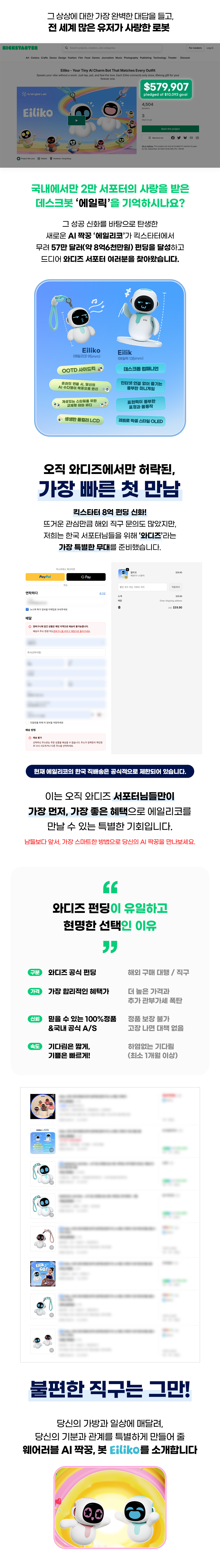 [펀딩 이유] 에일리코는 단순히 귀여운 장난감이 아니라, 감정과 교감을 나누는 작은 반려 로봇입니다. 이전 세대 모델인 에일릭(Eilik)은 이미 전 세계 30만 명 이상의 사용자가 선택한 성공적인 프로젝트로, 그 경험을 바탕으로 완전히 새롭게 설계된 것이 바로 에일리코입니다. 에일리코는 수년간의 연구와 테스트를 거쳐 완성되었습니다. EVT, DVT, PVT 단계의 개발 과정을 모두 통과했으며, 실제 사용자 피드백을 반영해 하드웨어와 소프트웨어의 안정성을 개선했습니다. 또한, Energize Lab은 47,000㎡ 규모의 제조 시설과 협력하여 드론과 로봇청소기를 생산해온 노하우를 기반으로 신뢰성 높은 품질 관리 시스템을 구축했습니다. 와디즈를 선택한 이유는 단순한 판매가 아니라, “사람과 로봇이 함께 살아가는 미래를 한국 서포터들과 함께 만들고 싶기 때문”입니다. 현대 사회에서는 여러 이유로 반려동물을 키우기 어려운 분들이 많습니다. 에일리코는 그런 분들을 위해 IT 기술로 탄생한 작고 따뜻한 반려 존재로, 서포터님들의 일상 속 외로움을 달래고 웃음을 더해줄 친구가 되어줄 것입니다. 와디즈는 새로운 기술과 아이디어를 이해하고, 함께 성장시켜주는 가장 열정적인 커뮤니티입니다.