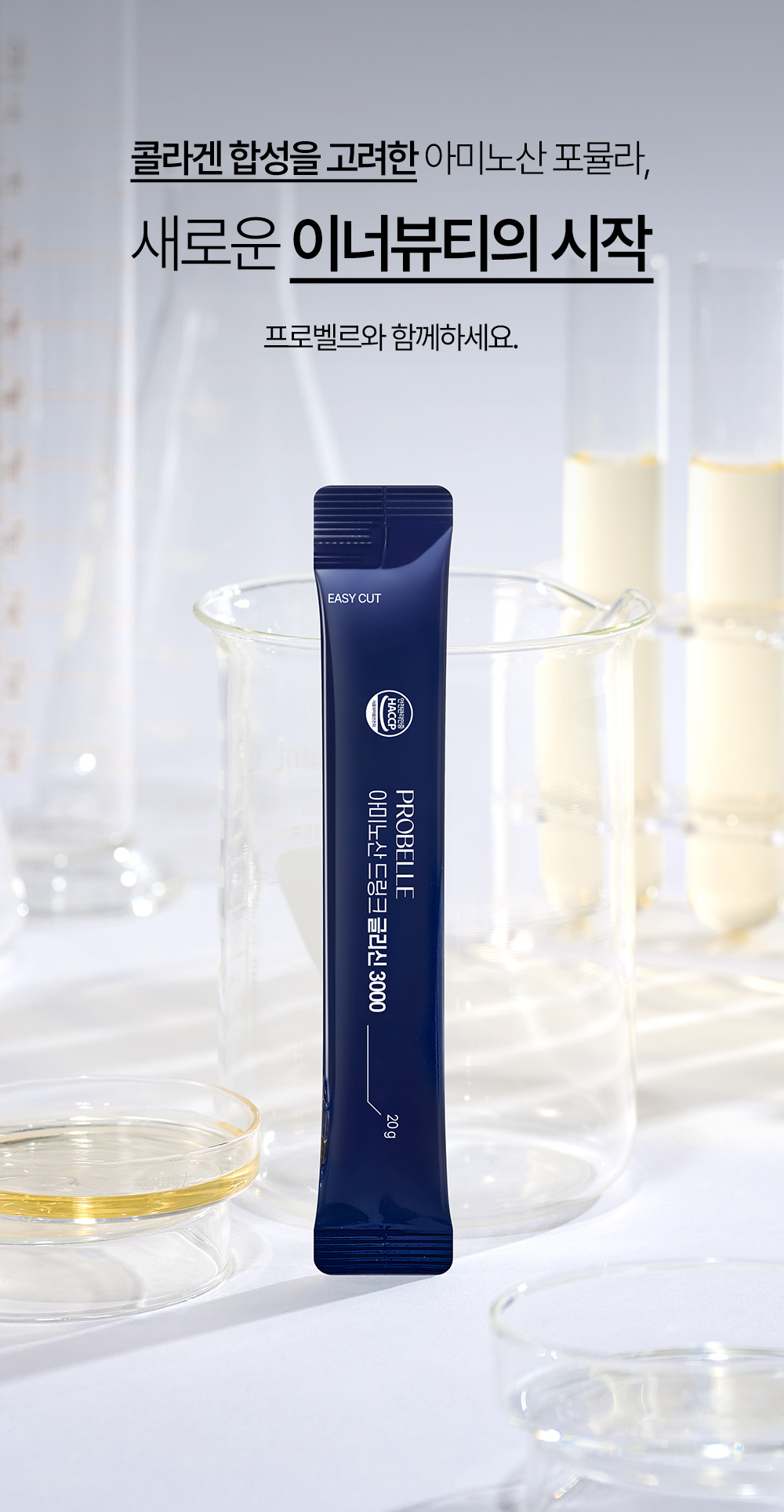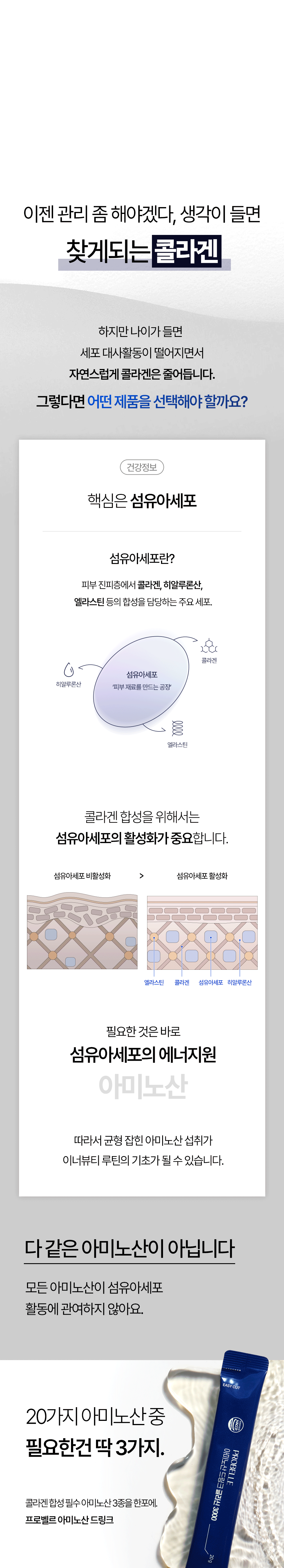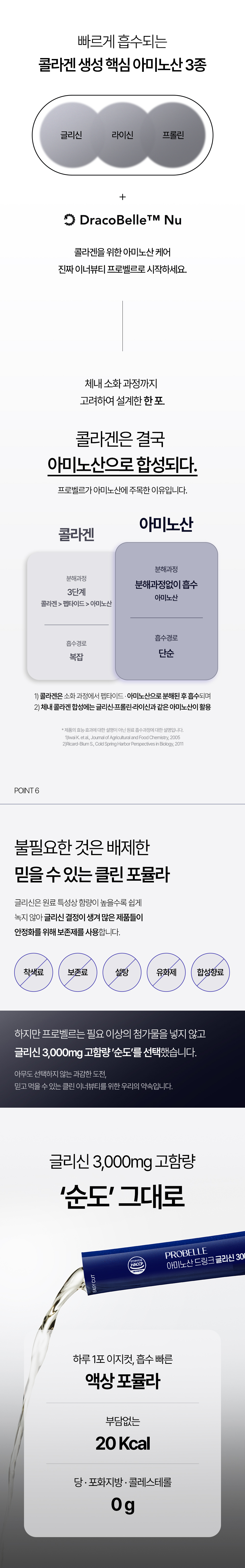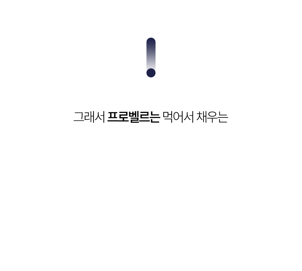 프로벨르는 글리신, 프롤린, 라이신 등 콜라겐 생성의 핵심 아미노산을 치밀하게 배합해 설계하여 콜라겐 합성을 유도하는 포뮬라를 완성했습니다.