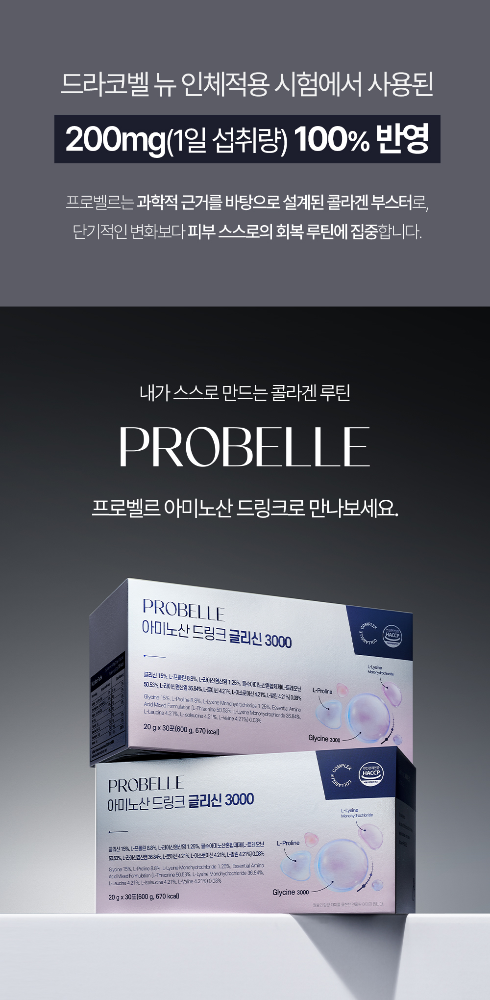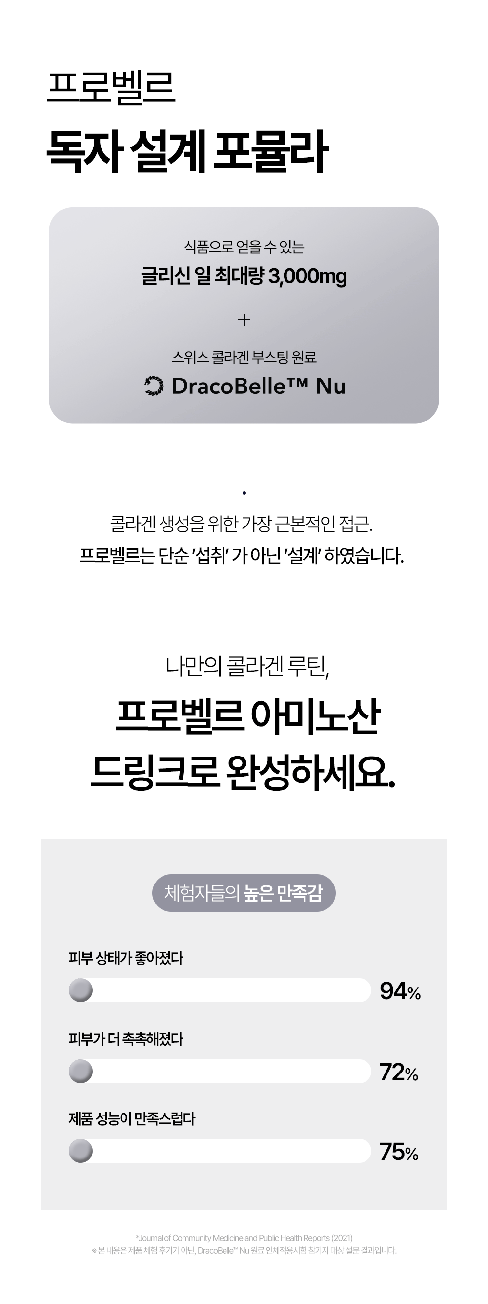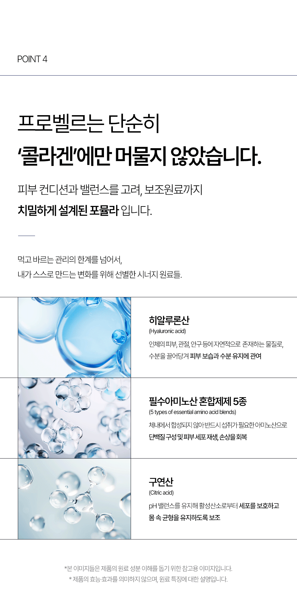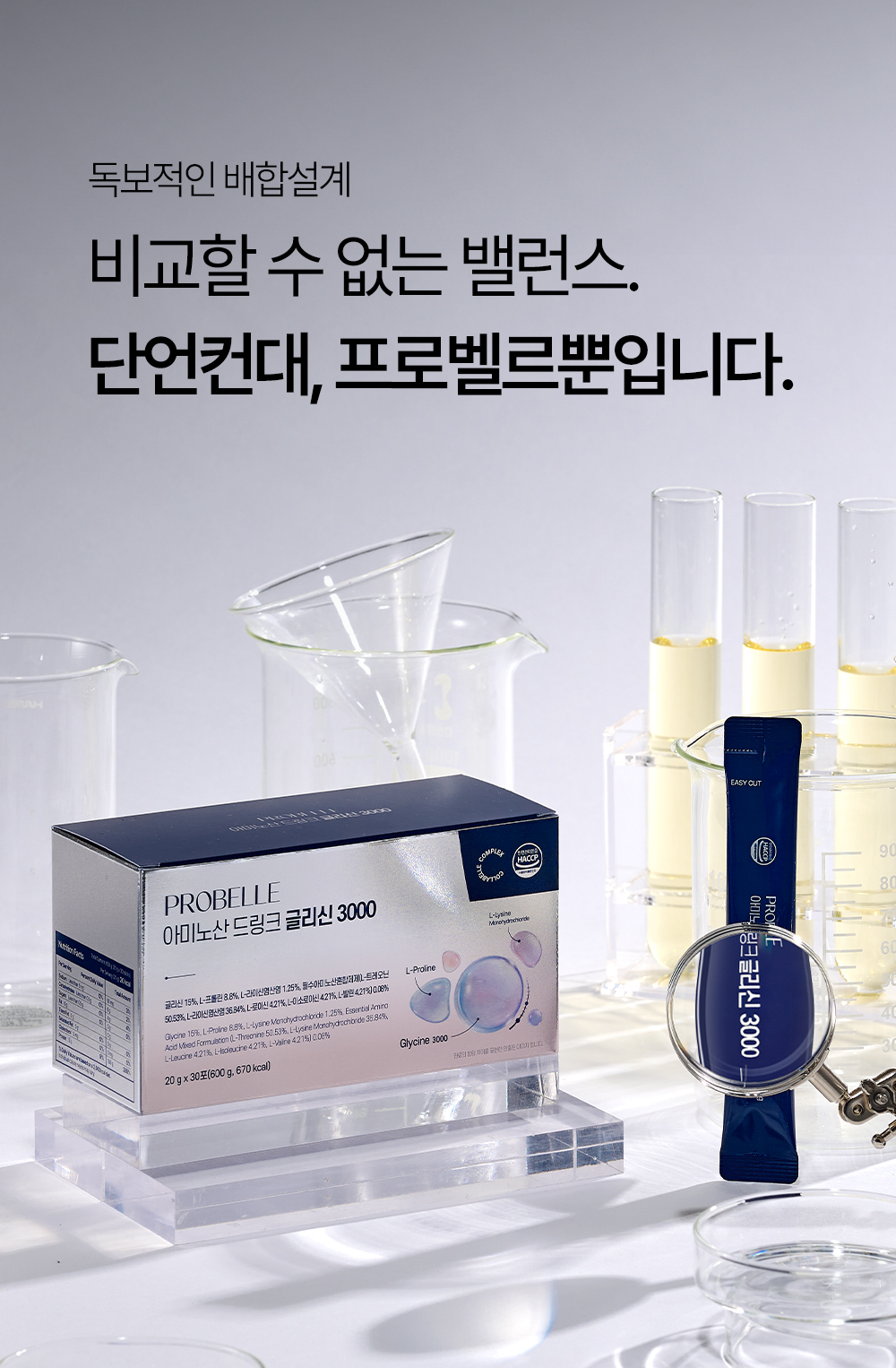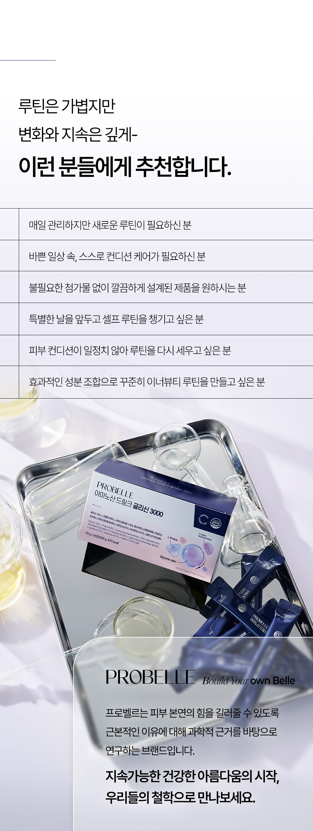 프로벨르는 글리신, 프롤린, 라이신 등 콜라겐 생성의 핵심 아미노산을 치밀하게 배합해 설계하여 콜라겐 합성을 유도하는 포뮬라를 완성했습니다.