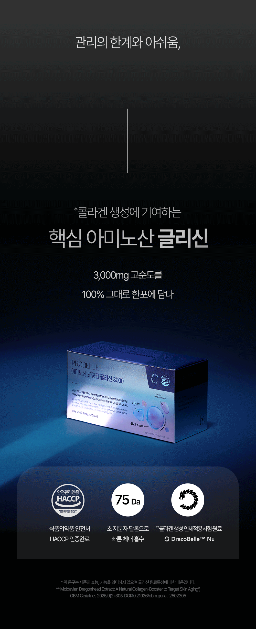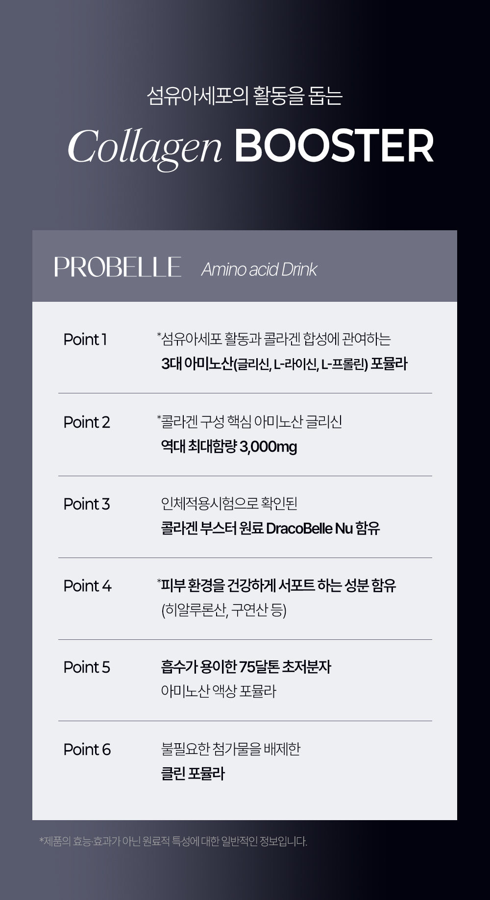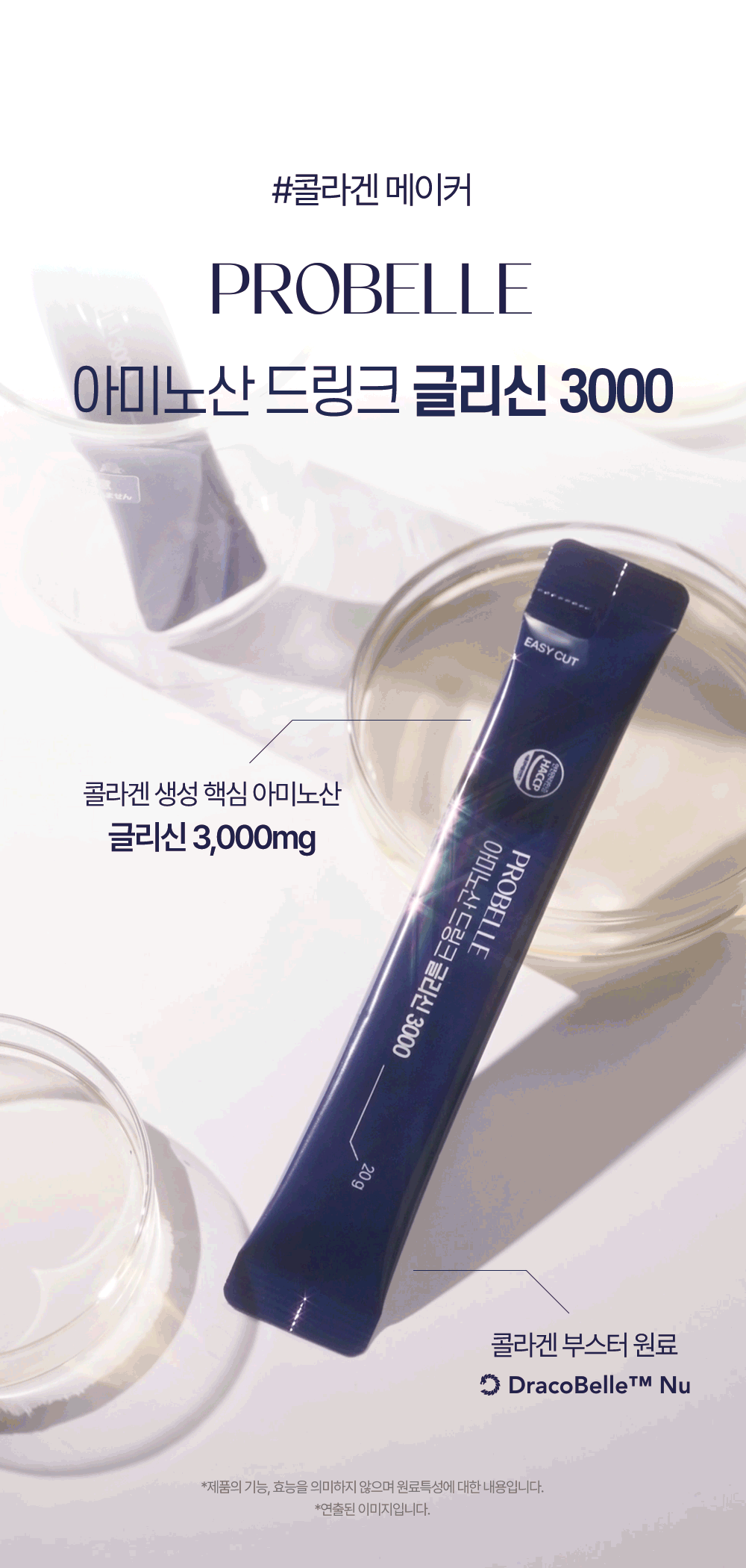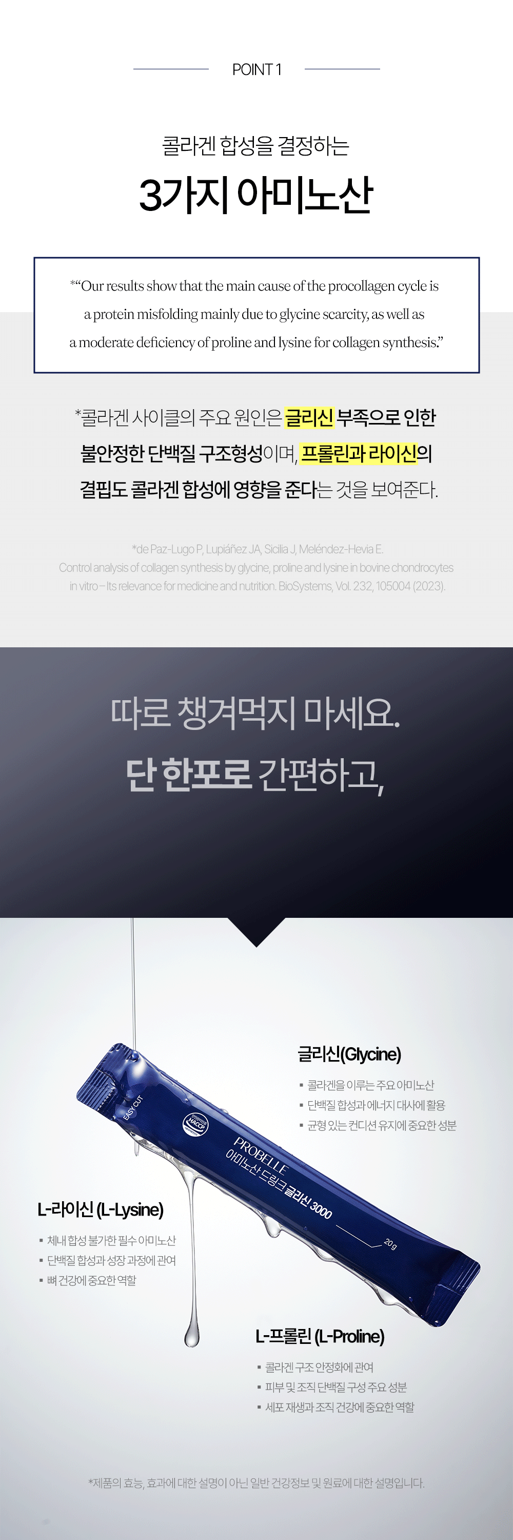 프로벨르는 글리신, 프롤린, 라이신 등 콜라겐 생성의 핵심 아미노산을 치밀하게 배합해 설계하여 콜라겐 합성을 유도하는 포뮬라를 완성했습니다.