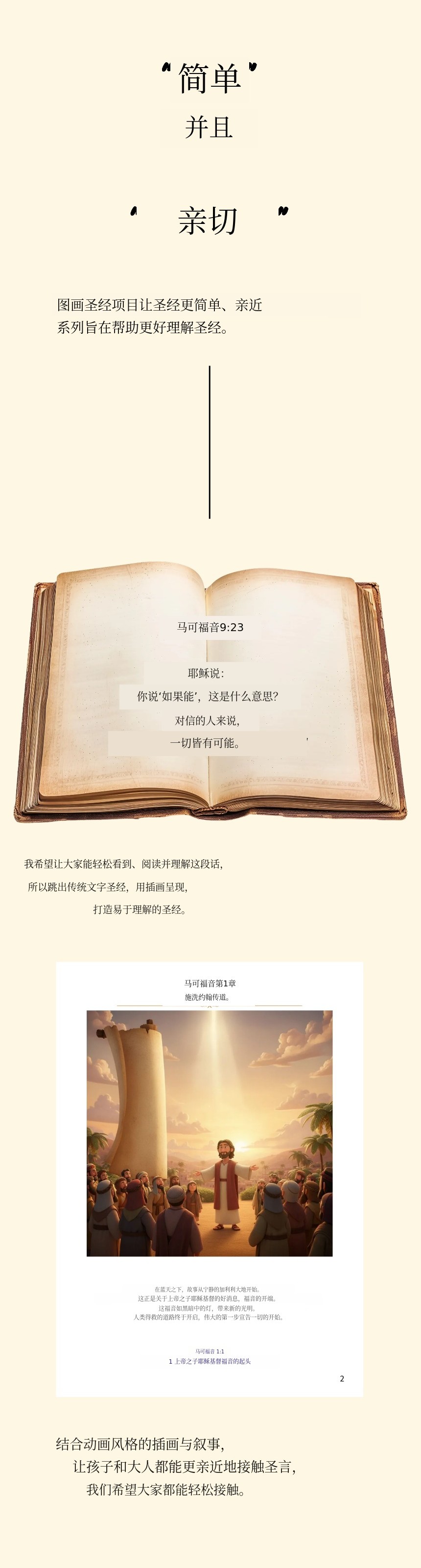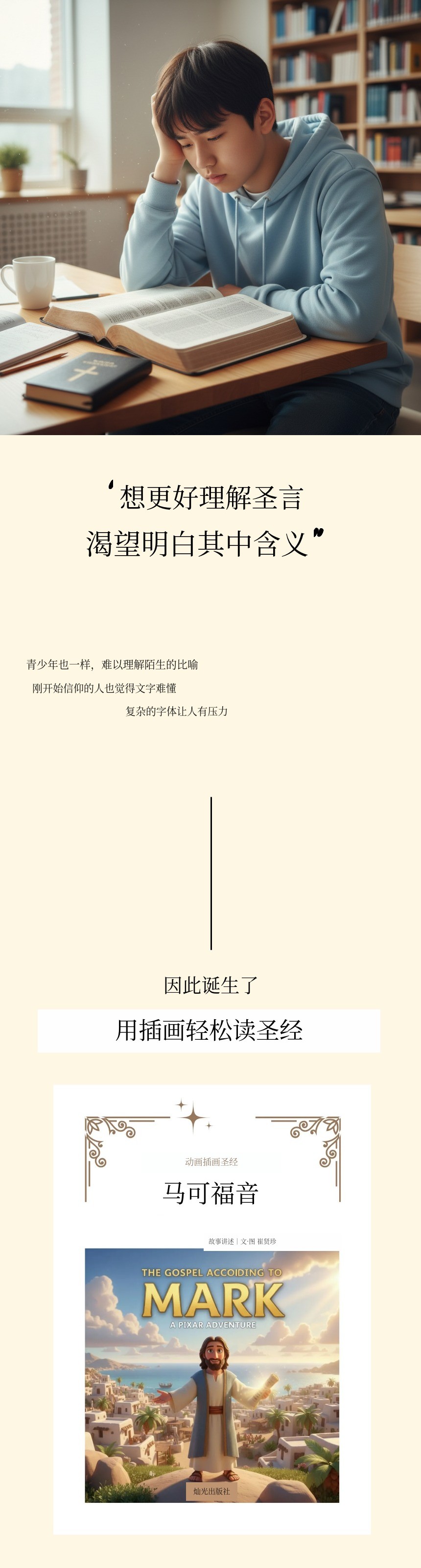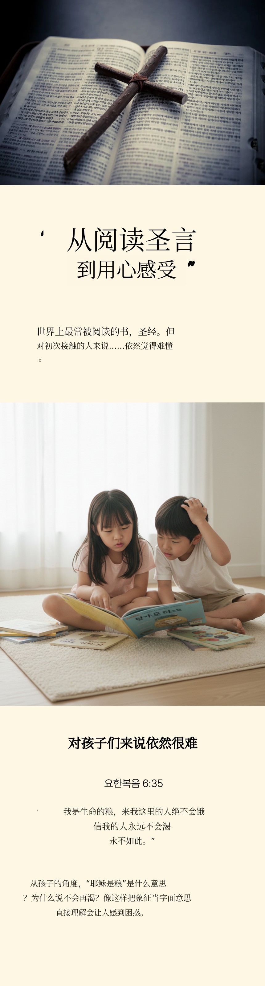 特别是马太福音、马可福音、路加福音、约翰福音,这些书中有许多深刻的属灵意义和象征,对于初次接触圣经的儿童、青少年,以及刚开始信仰的人来说并不容易 会觉得很难。