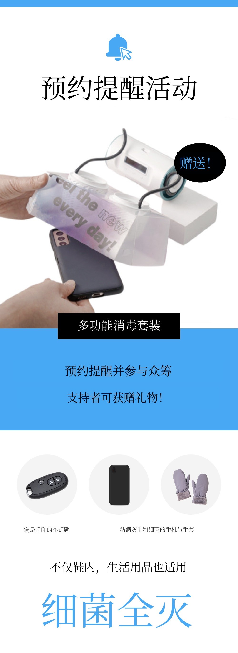 A. 操作部的红色灯光为热风指示灯,蓝色灯光为UV指示灯。红灯和蓝灯同时亮起的15分钟、30分钟模式为简易模式,热风和UV同时工作。其他模式下,先亮起红灯,通过热风对鞋内各处进行杀菌干燥,最后30分钟亮起蓝灯,UV对产品本身消毒并杀菌残留细菌。