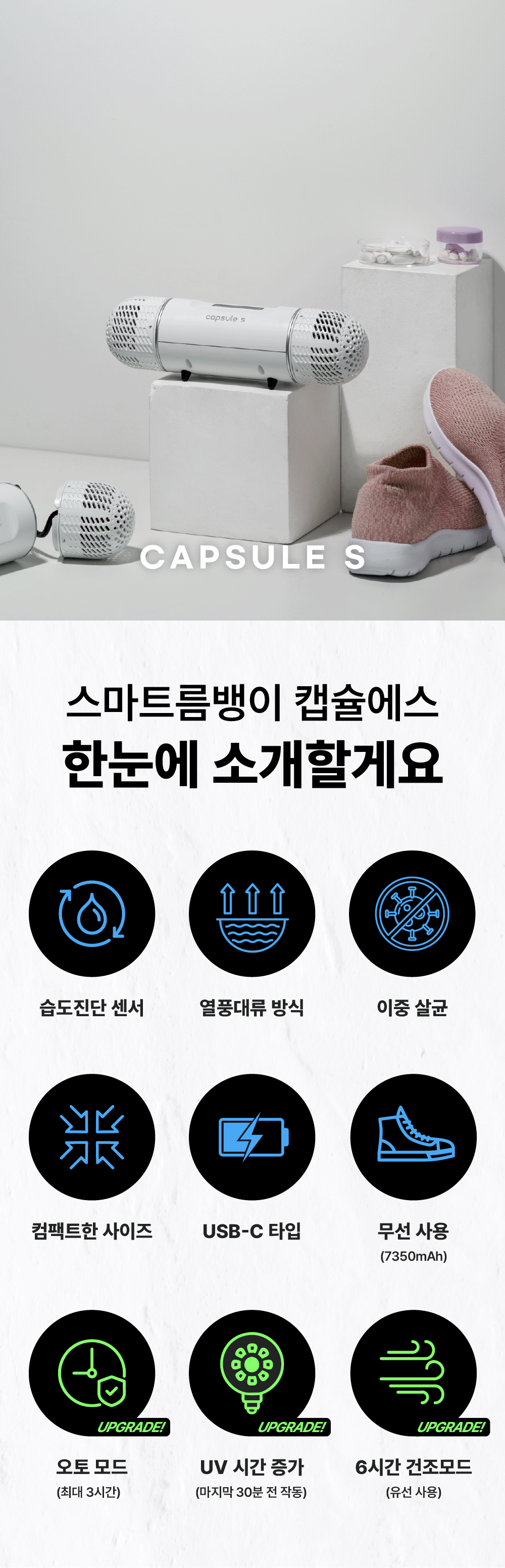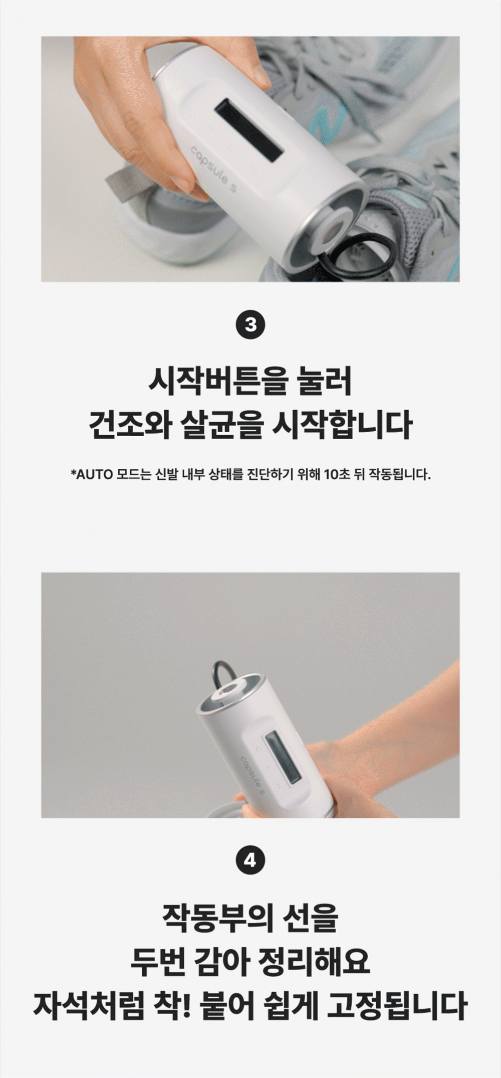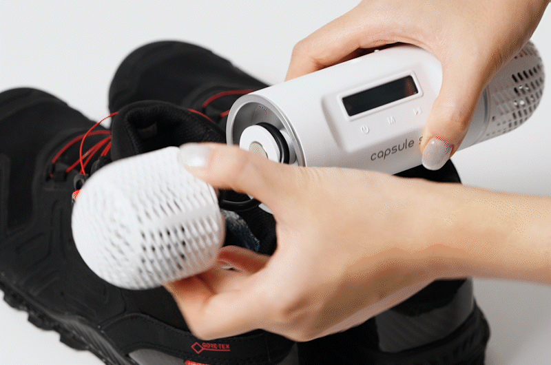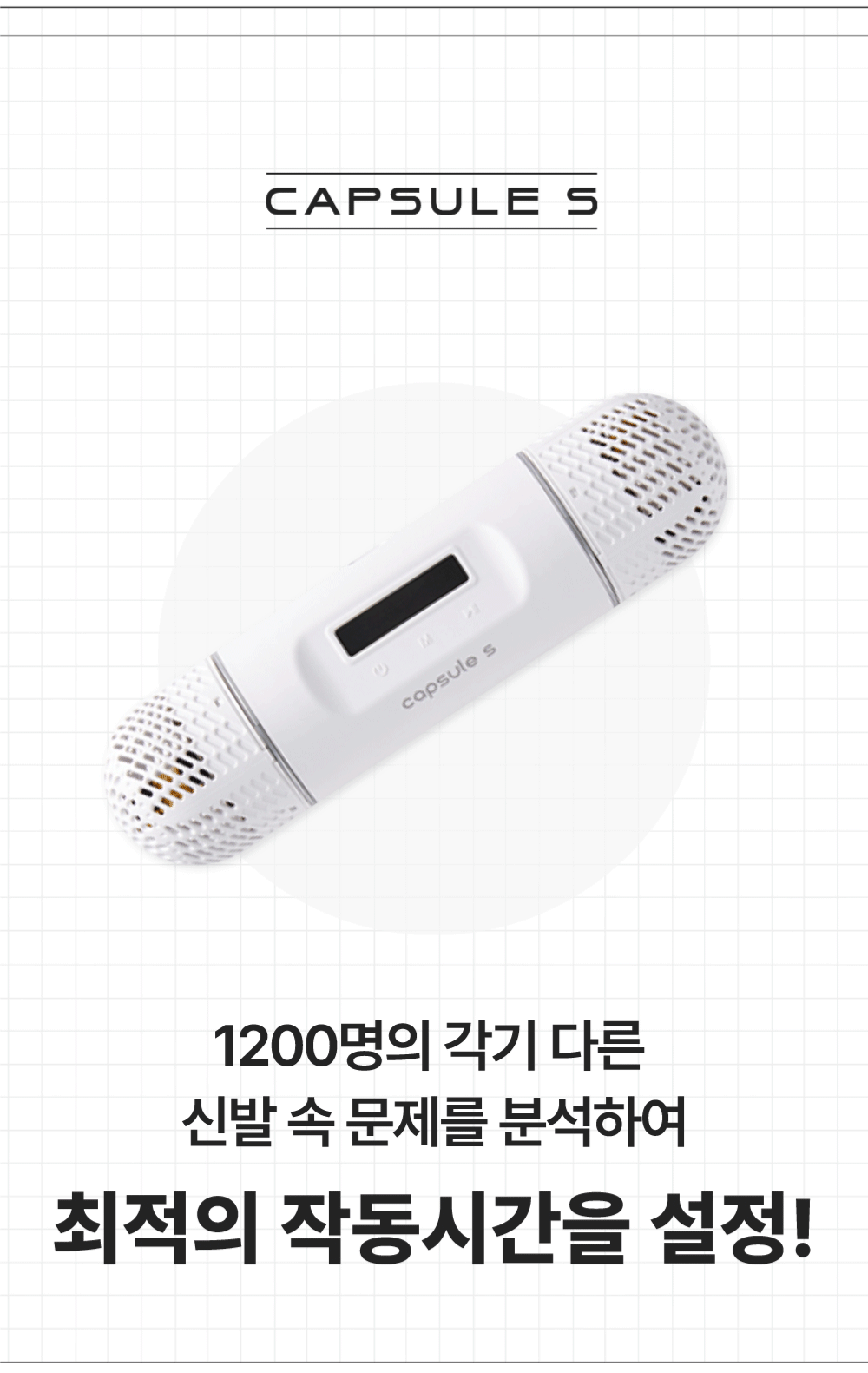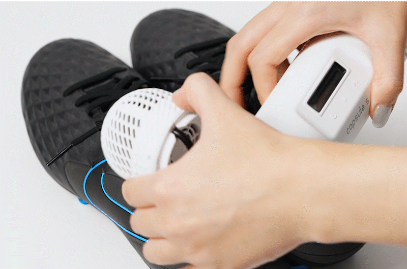 A. Capsule S的烘干功能最适合管理因汗水变潮湿的鞋内。鞋子清洗后请充分去除水分后,用有线连接,推荐使用6小时模式。(根据鞋子状况可多用几次。)因非防水产品,请务必脱水后再使用。