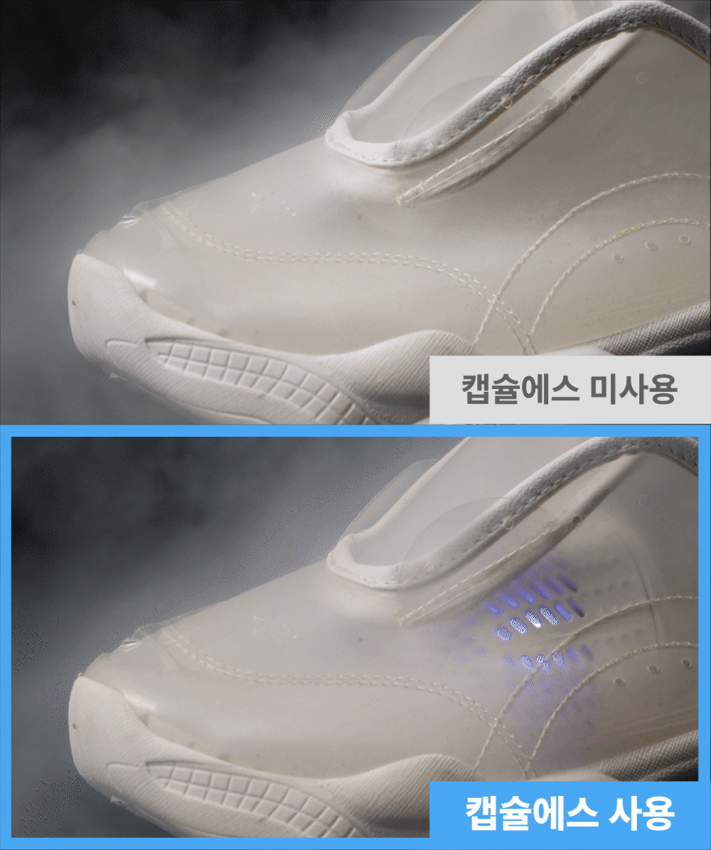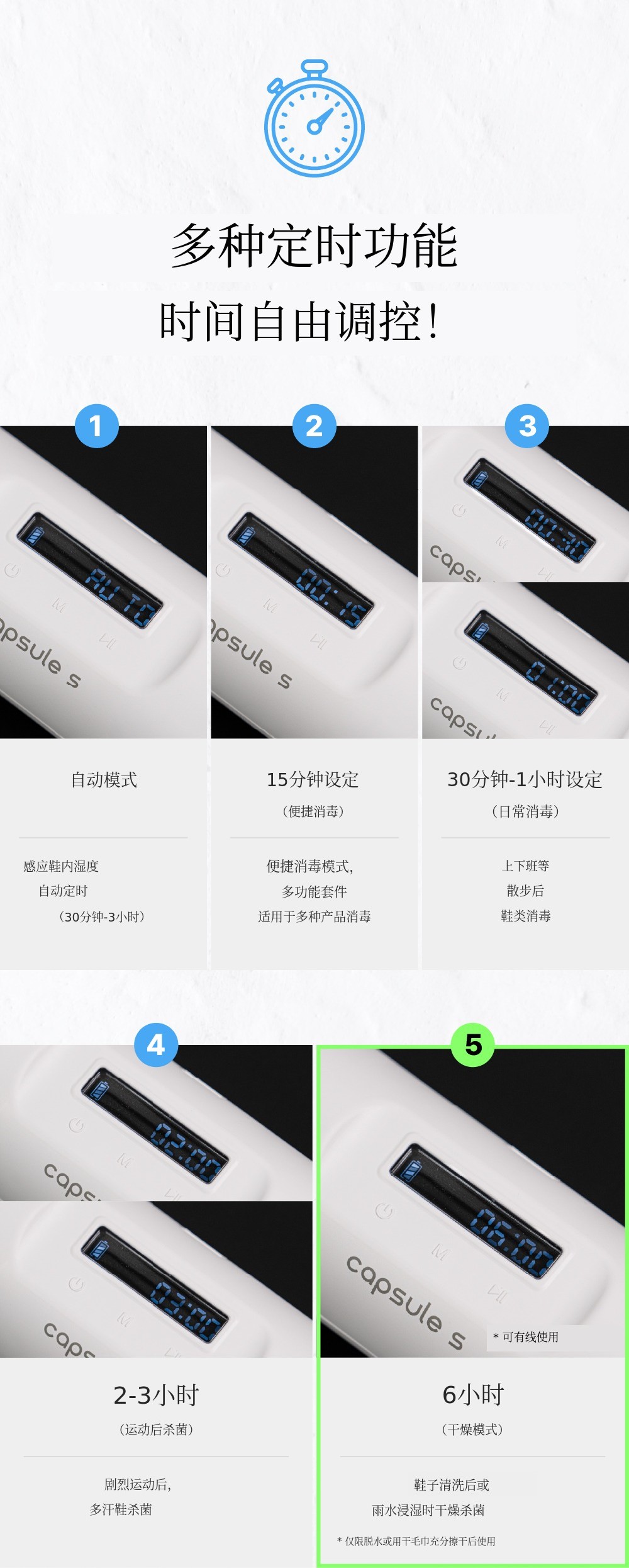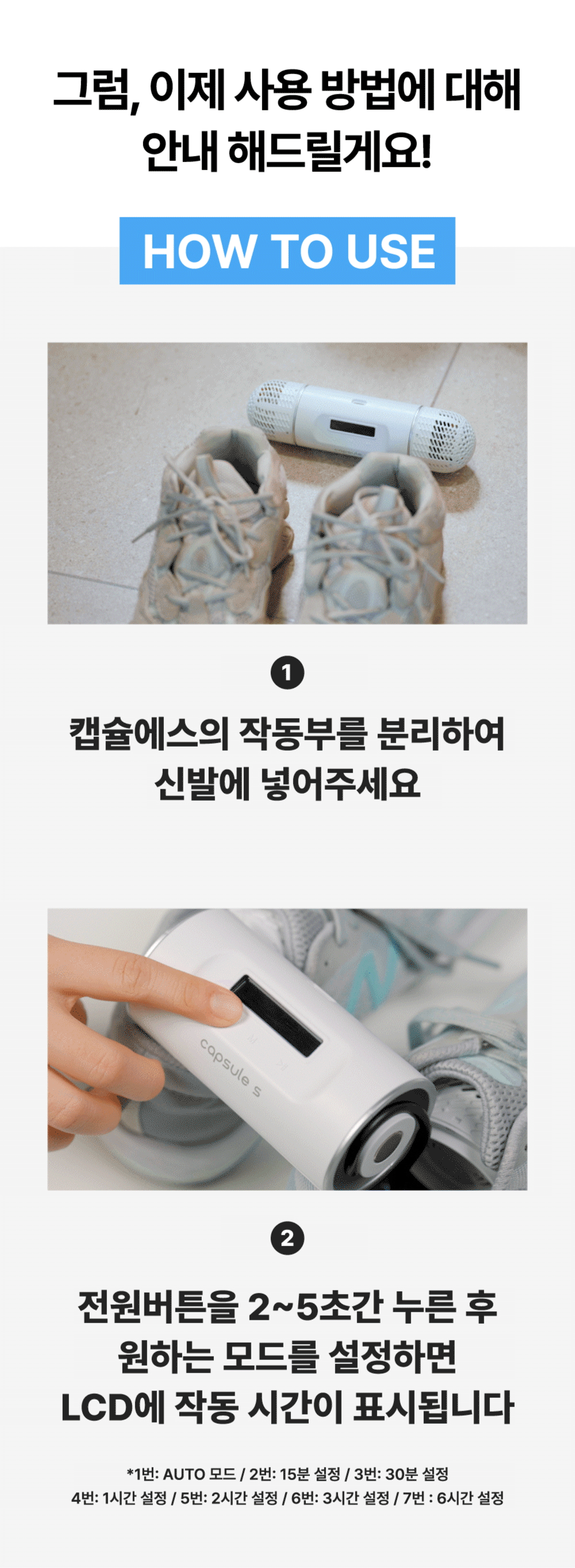 A. Capsule S的烘干功能最适合管理因汗水变潮湿的鞋内。鞋子清洗后请充分去除水分后,用有线连接,推荐使用6小时模式。(根据鞋子状况可多用几次。)因非防水产品,请务必脱水后再使用。