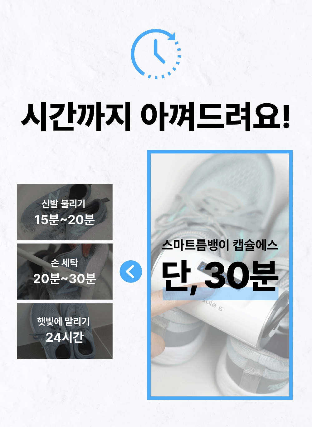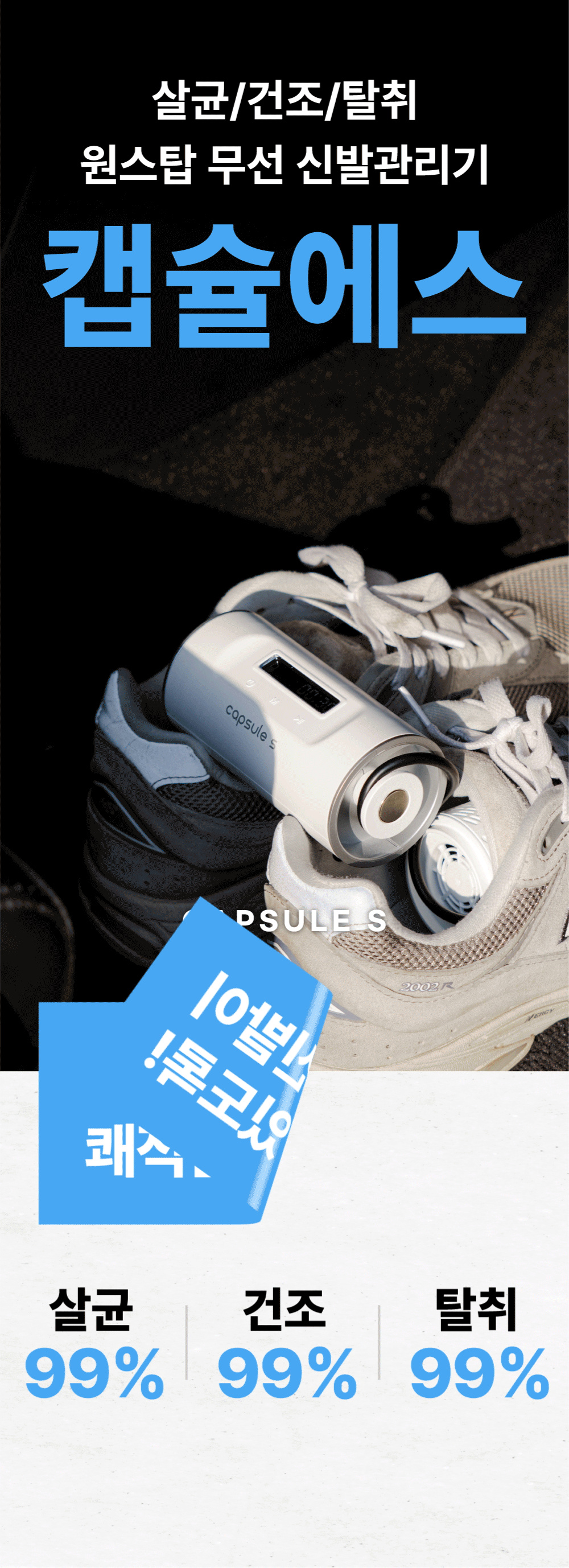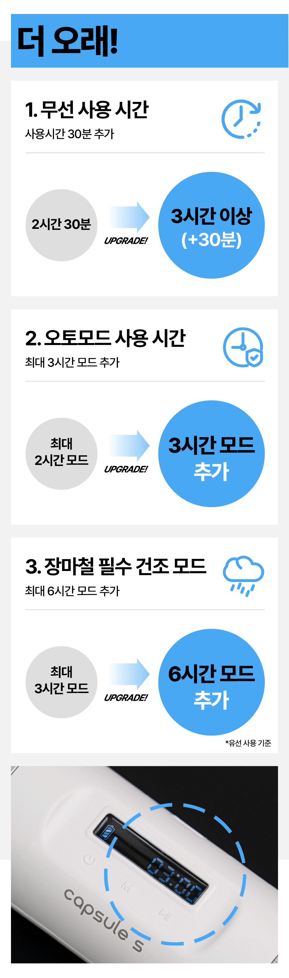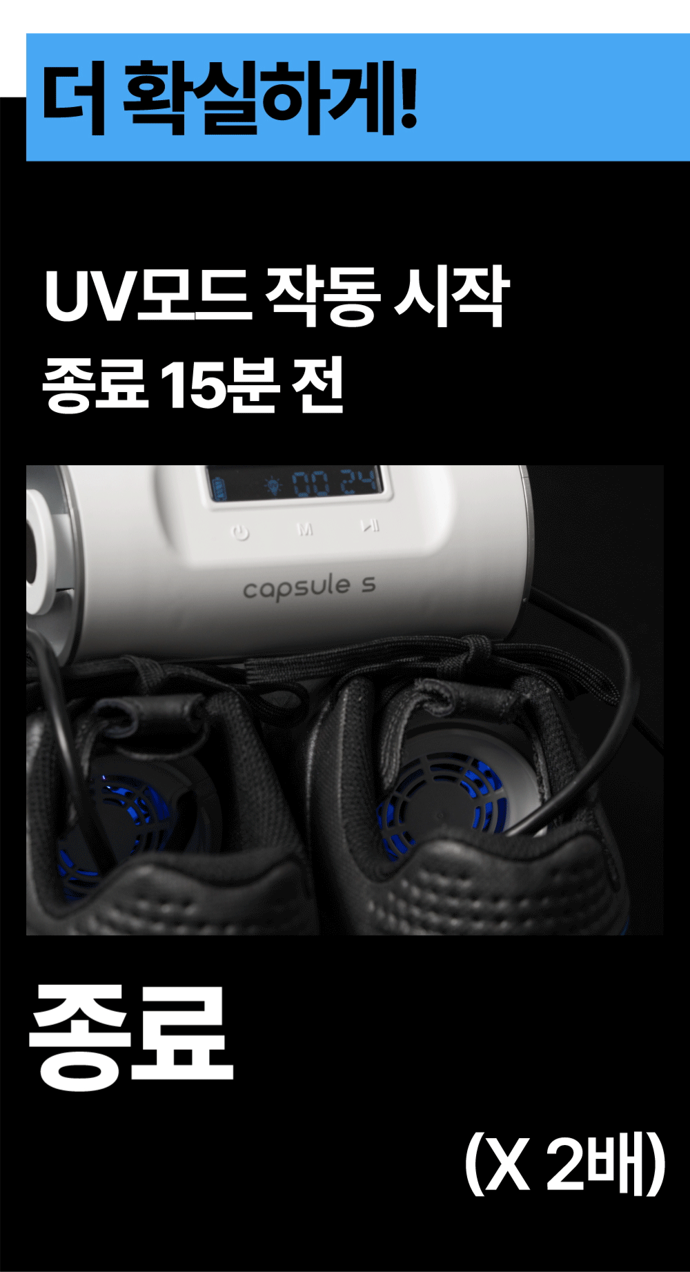 A. Capsule S的烘干功能最适合管理因汗水变潮湿的鞋内。鞋子清洗后请充分去除水分后,用有线连接,推荐使用6小时模式。(根据鞋子状况可多用几次。)因非防水产品,请务必脱水后再使用。