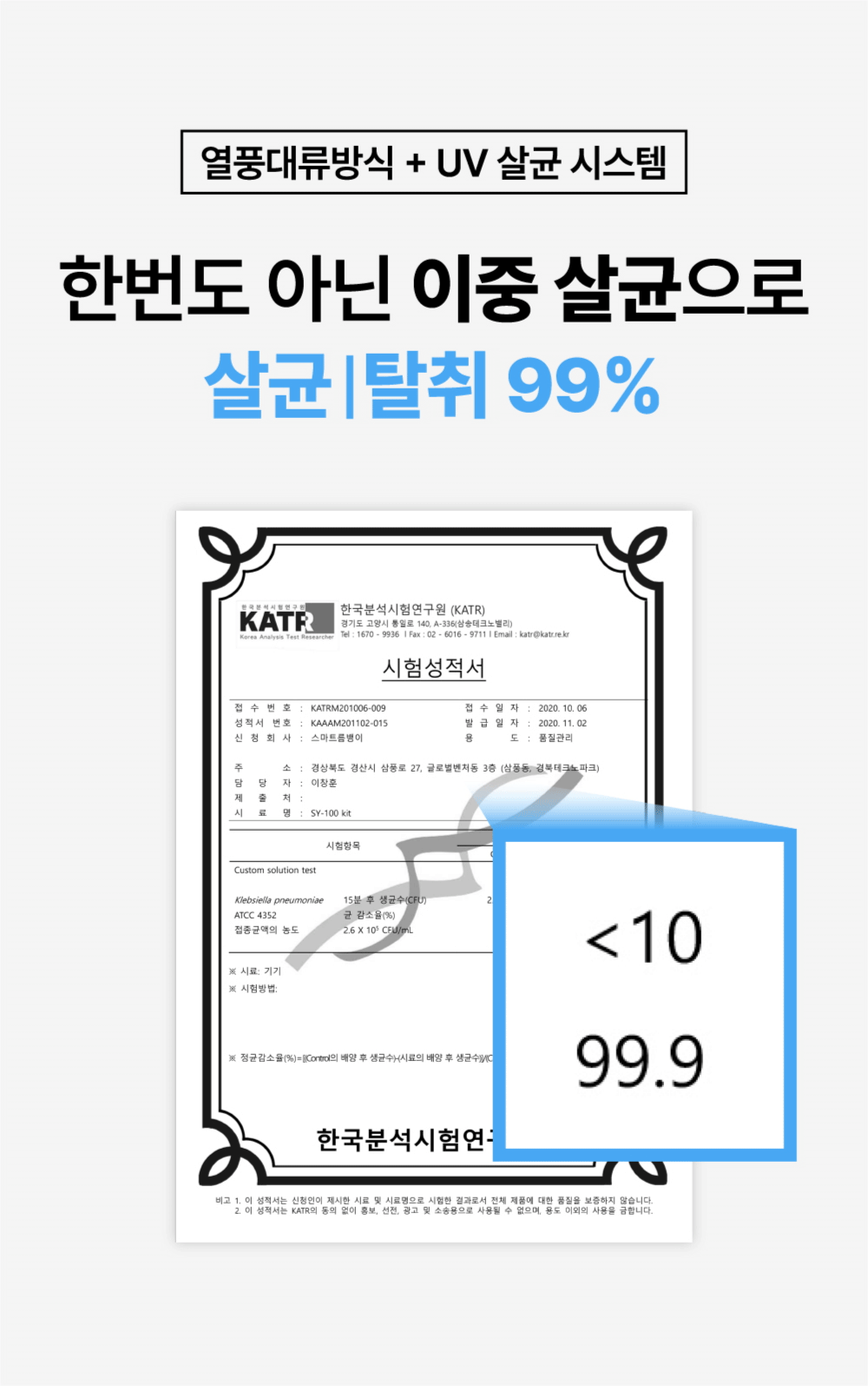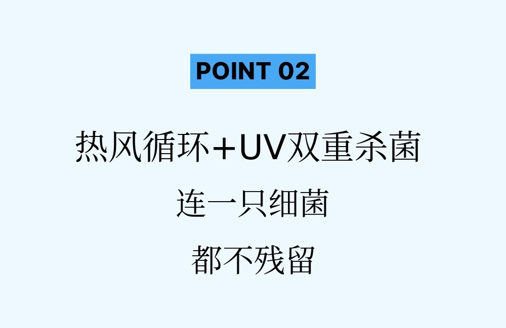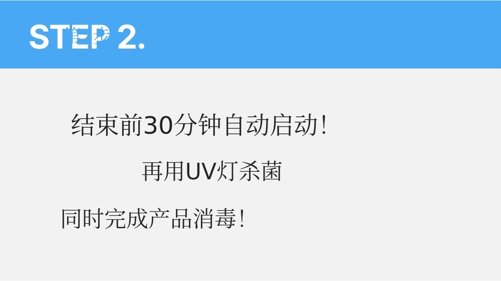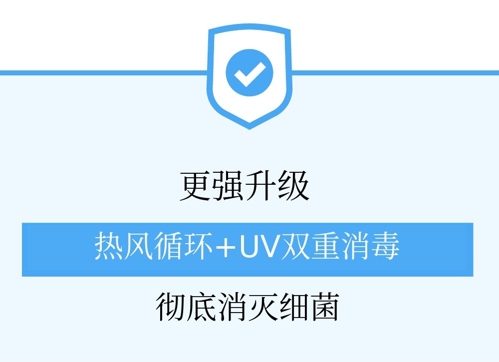 在第一阶段热风杀菌过程中去除湿气后,UV灯会在30分钟内运作,通过这个过程再次杀菌可能残留的细菌,并对附着在作动部的细菌进行消毒。