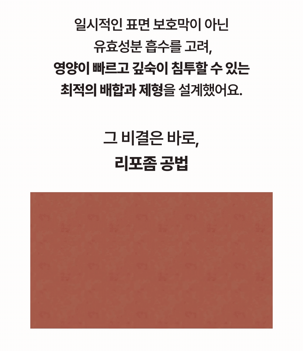 유효성분을 피부 세포막의 구성과 유사하게 리포좀화하여, 피부 친화력과 침투력을 높였어요. 이를 통해 열 등의 외부 환경요인에도 안전하게 함량을 유지시키고, 유효성분을 피부 깊숙이 전달해 효능을 극대화시킬 수 있어요.