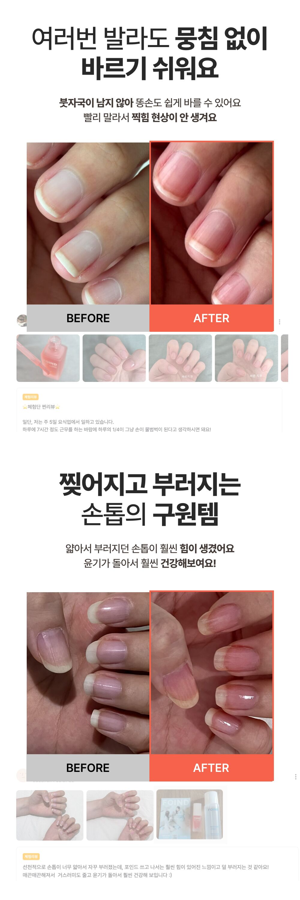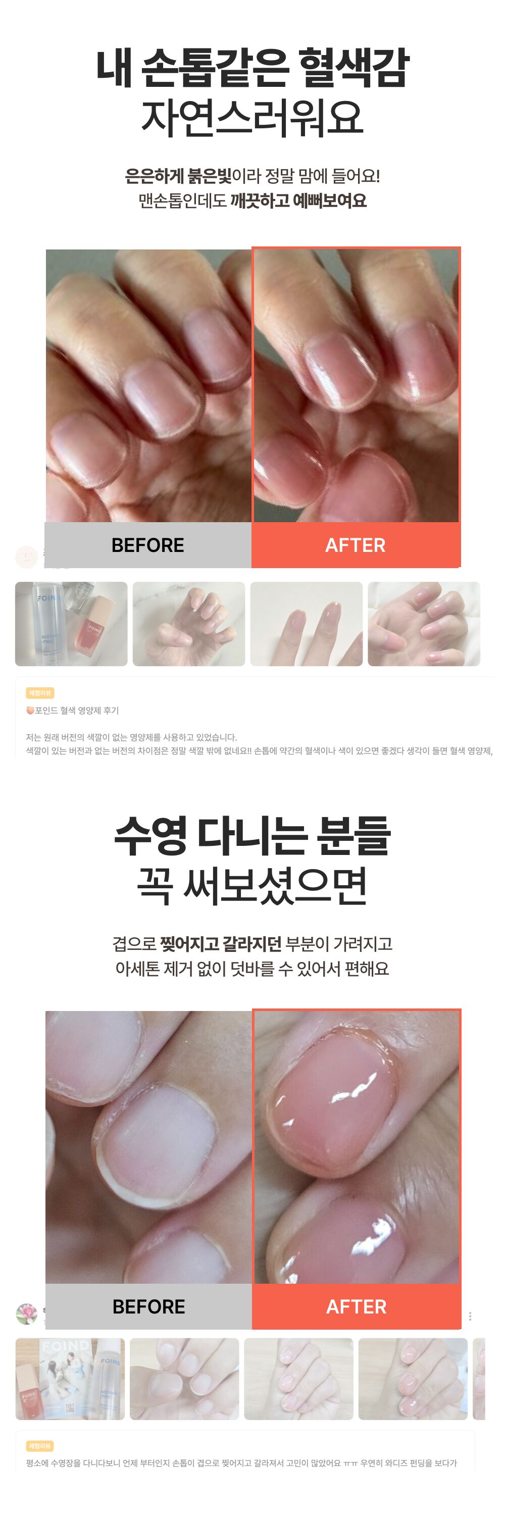 이번에 새롭게 선보이는 혈색영양제도 여러분의 손끝에 꼭 필요한 제품이길 바라요. 숨기고만 싶었던 맨손톱이 이제는 편안하고 자연스러워진 저처럼, 더 많은 분들이 포인드와 함께 단단한 손끝으로 삶을 주도하고, 본연의 모습 그대로를 아끼고 사랑할 수 있기를 바랍니다.