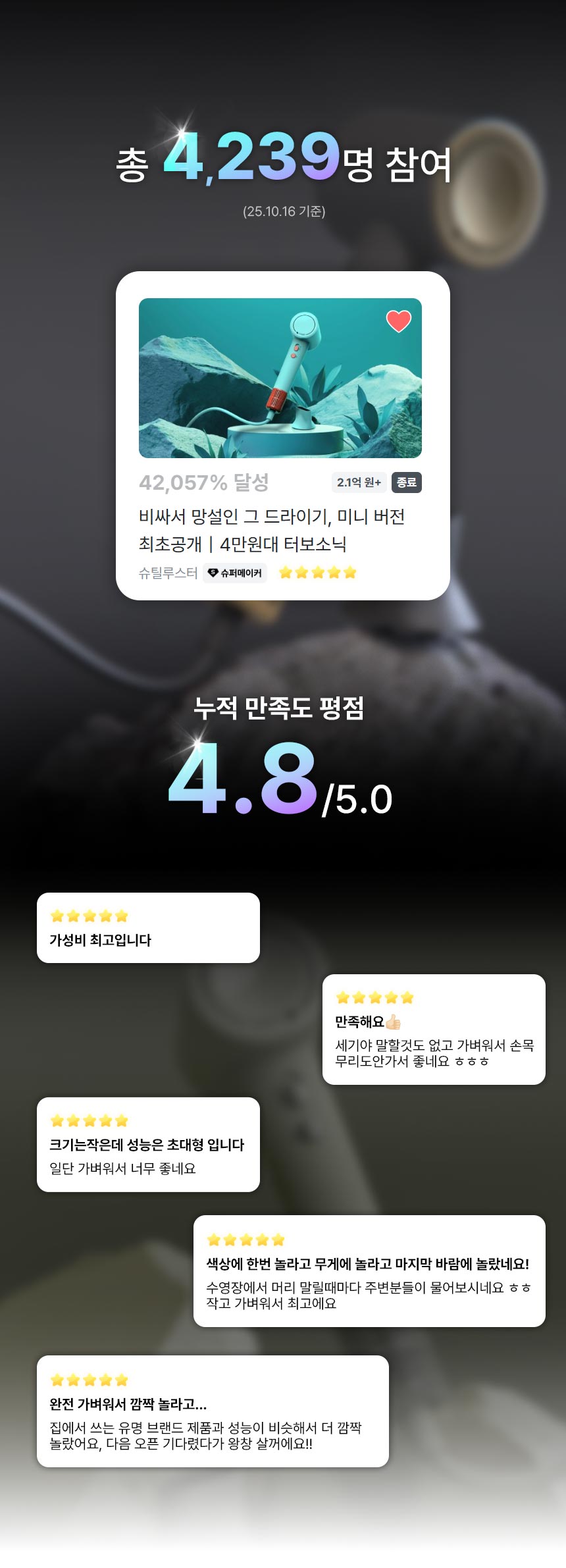 다수의 헤어 제품 펀딩을 진행하며 좋은 후기와 많은 피드백을 전달받았습니다.
