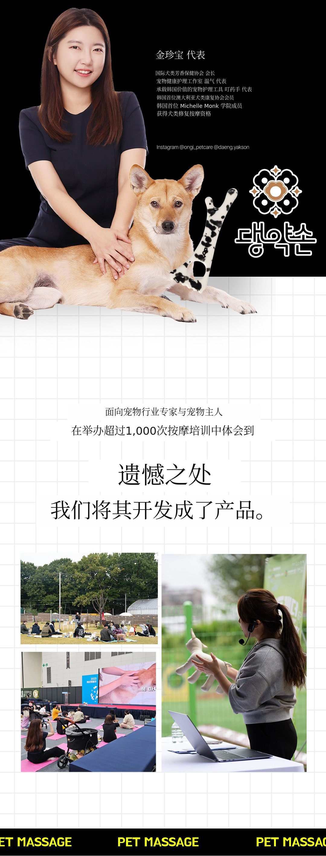 - 还会附上满载宠物狗按摩小窍门的使用指南一起送给您。 不是只放在家里的宠物按摩师,而是每天都能用的按摩工具!(在Instagram上也会持续上传使用方法视频和按摩流程!)