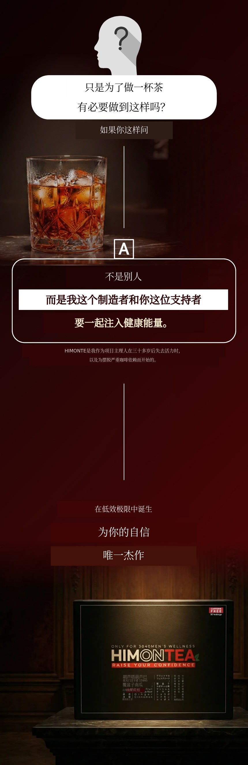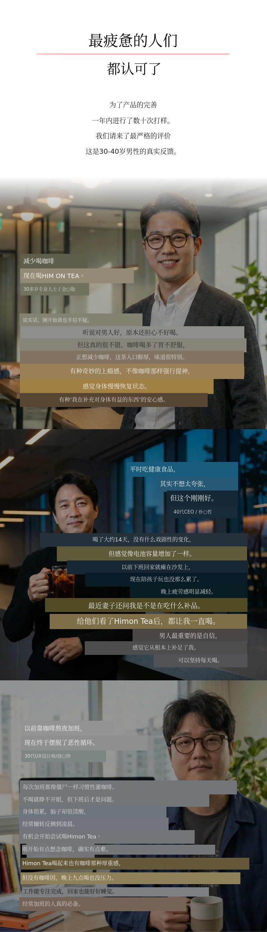 为了帮助30-40岁男性找回失去的平衡,我想毫不吝啬地加入最好的原料,但在一般的流通结构下,几乎不可能维持如此高的标准。为了控制成本必须减少含量,为了方便流通又不得不在品质上妥协。