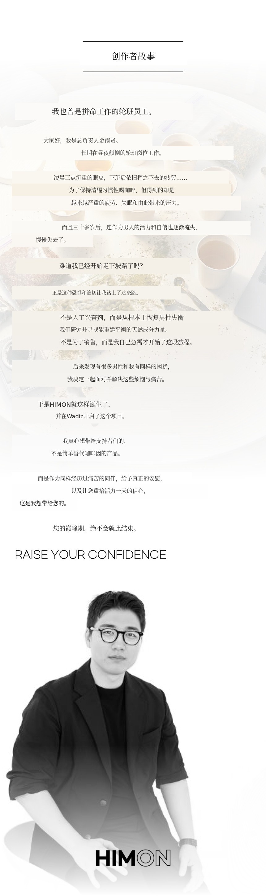 就像HIMON的口号“RAISE YOUR CONFIDENCE”一样,我们支持成为社会中坚力量的30-40岁男性们充满活力和自信的生活。同时我也相信Wadiz的支持者们是勇敢投资于前所未有价值的优秀挑战者。
