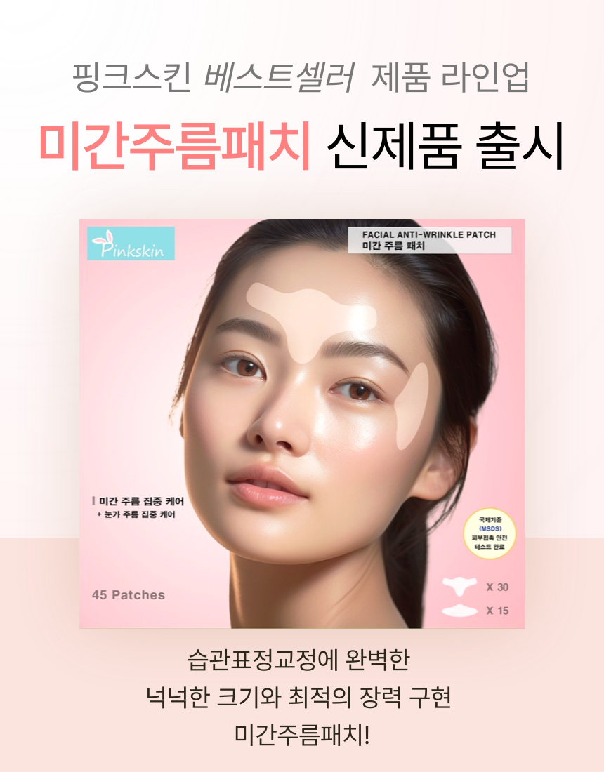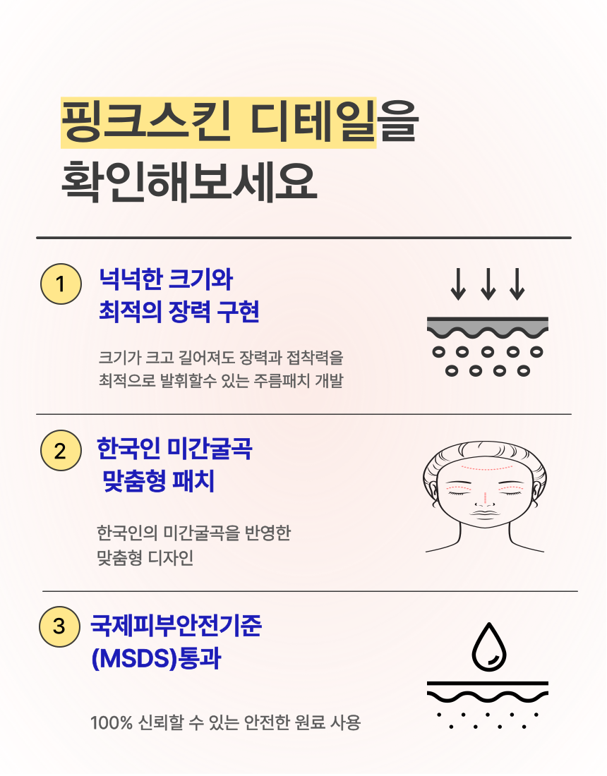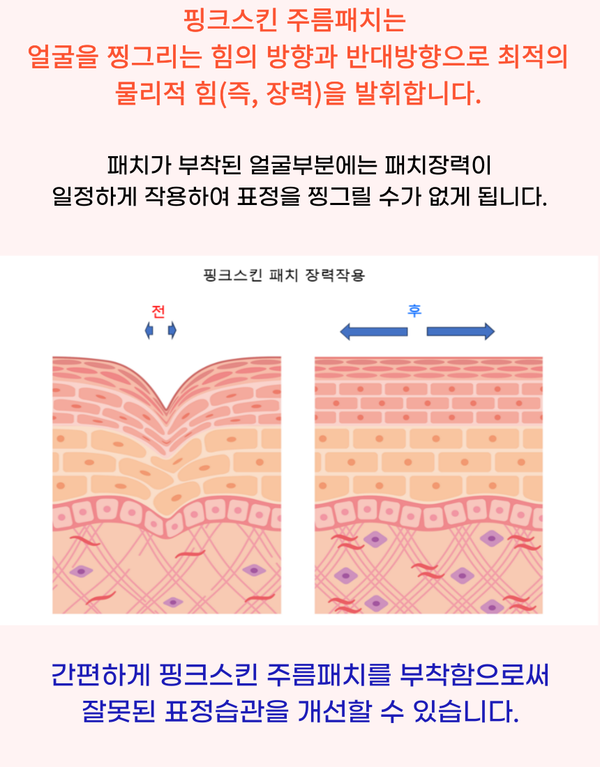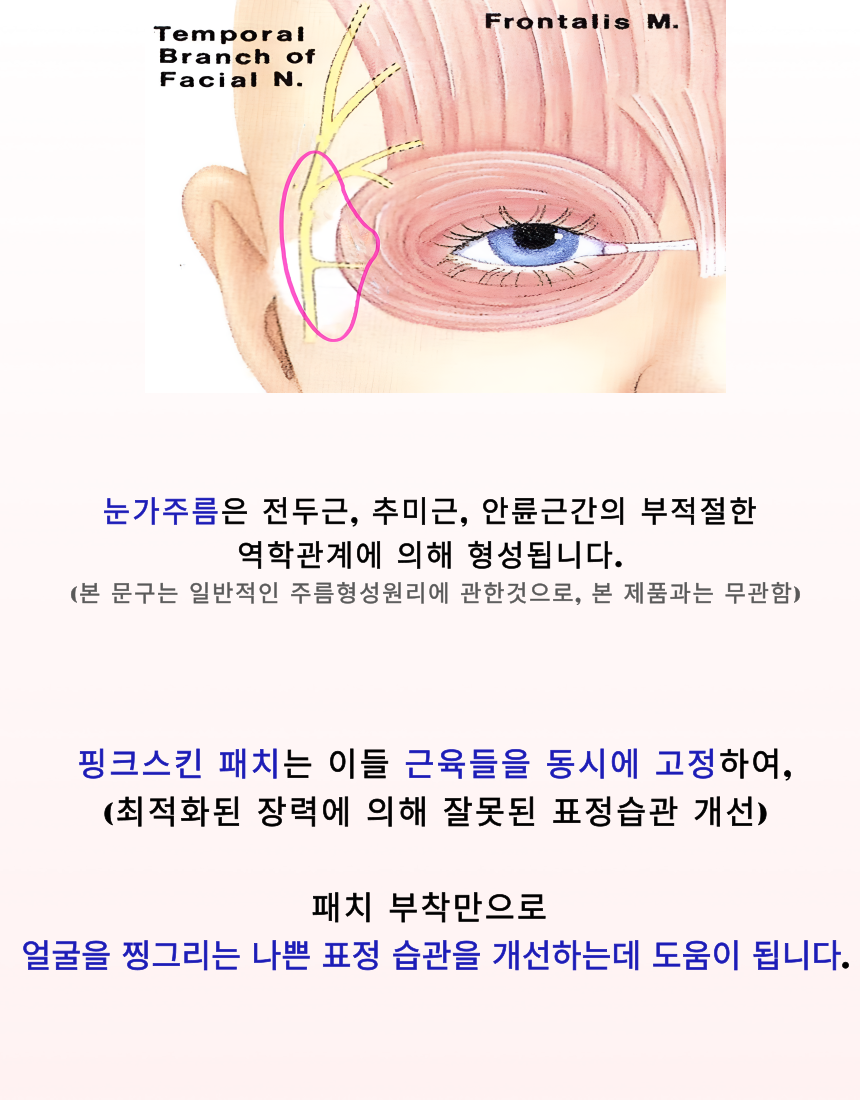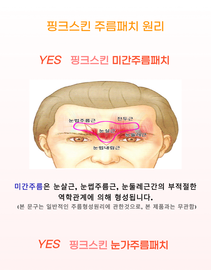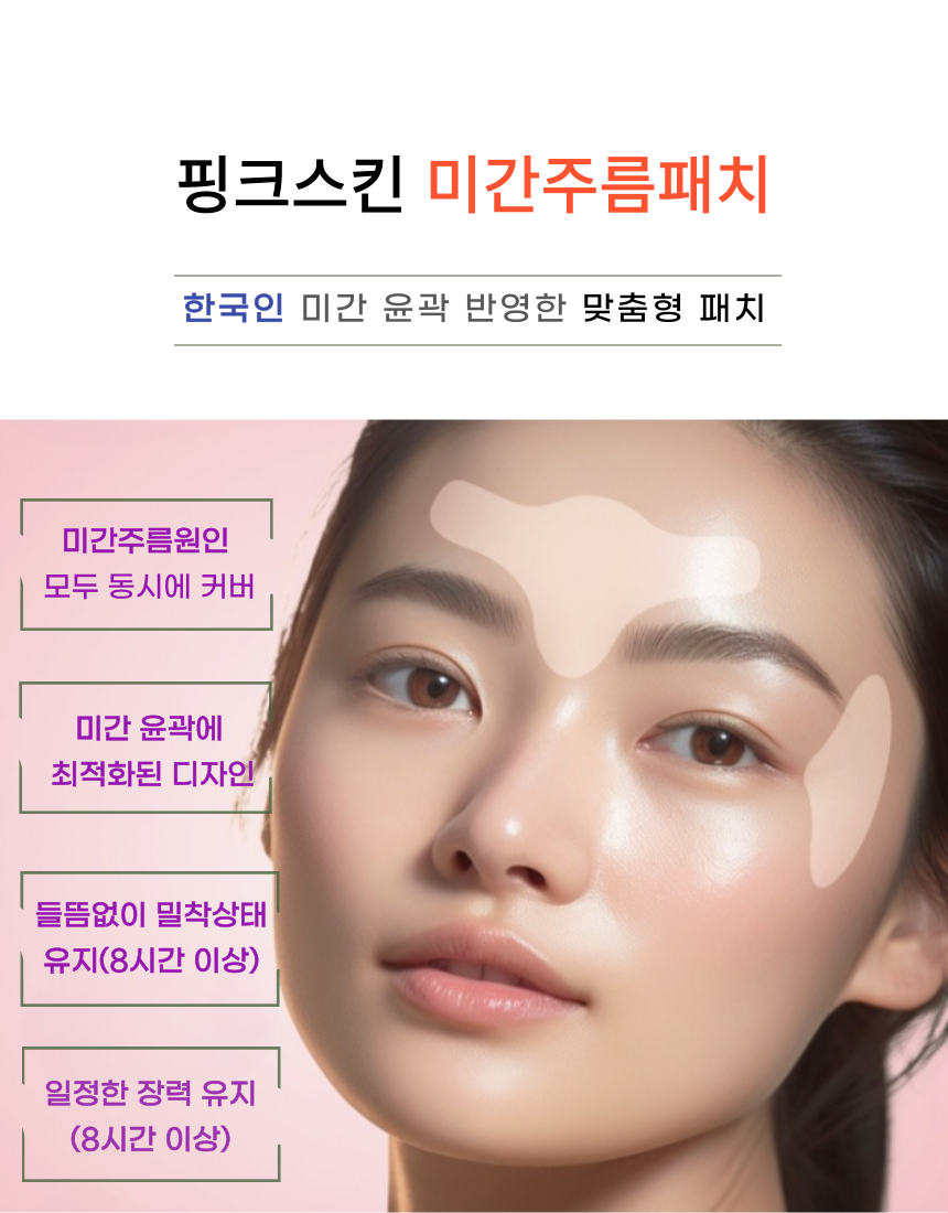 마침내 미간 전체를 커버 할수 있을 만큼 폭 및 길이를 증가시키더라도 장력과 접착력을 최적으로 발휘할 수 잇는 주름 패치를 개발하게 되었습니다.