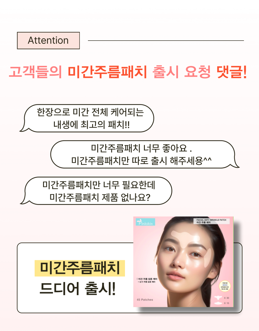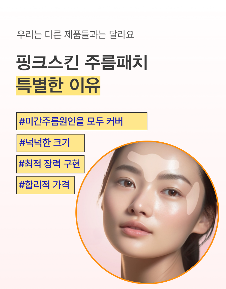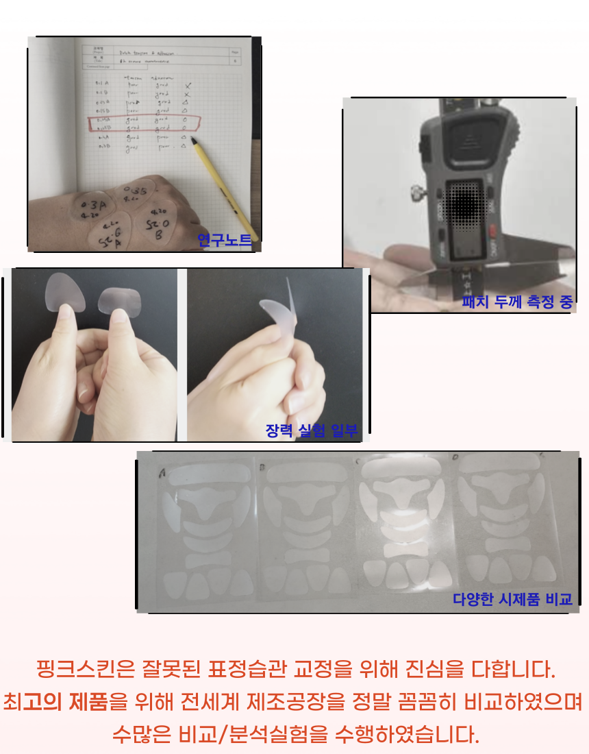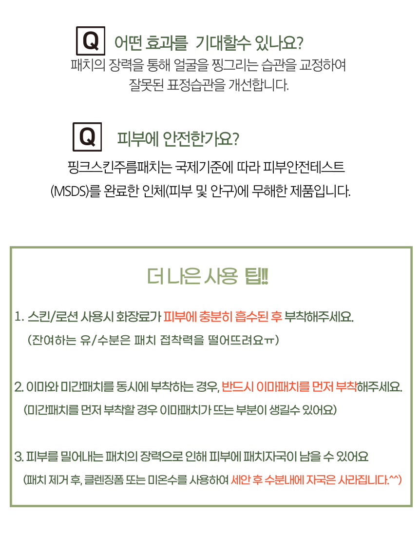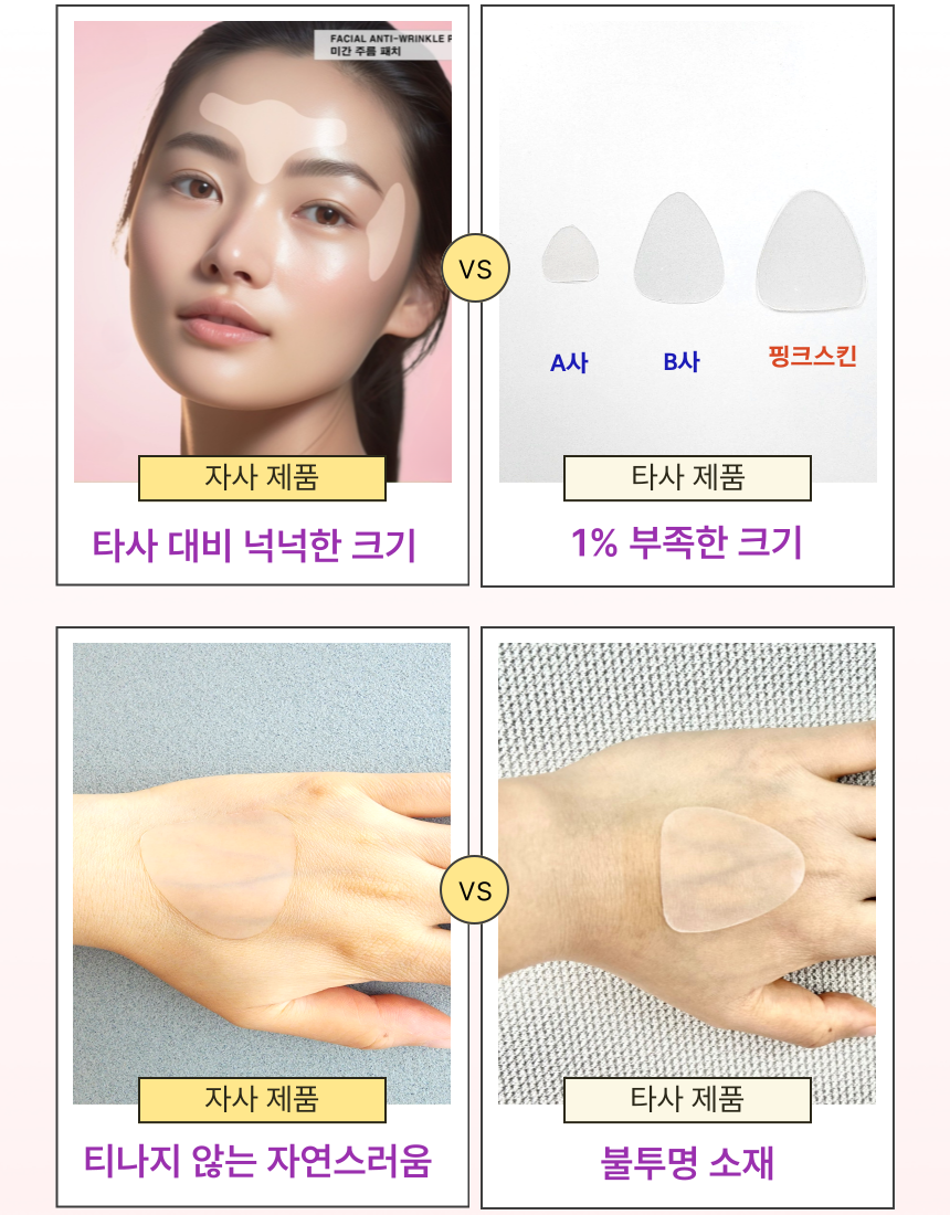 마침내 미간 전체를 커버 할수 있을 만큼 폭 및 길이를 증가시키더라도 장력과 접착력을 최적으로 발휘할 수 잇는 주름 패치를 개발하게 되었습니다.