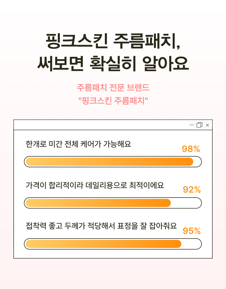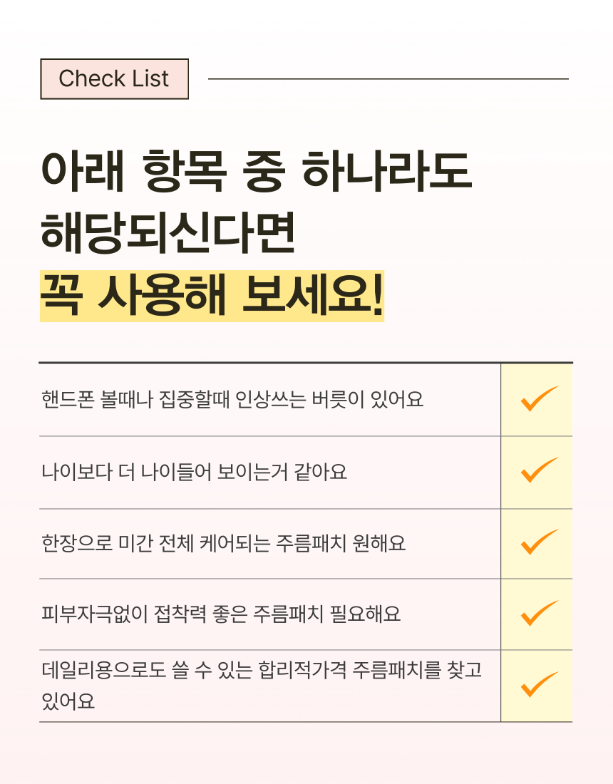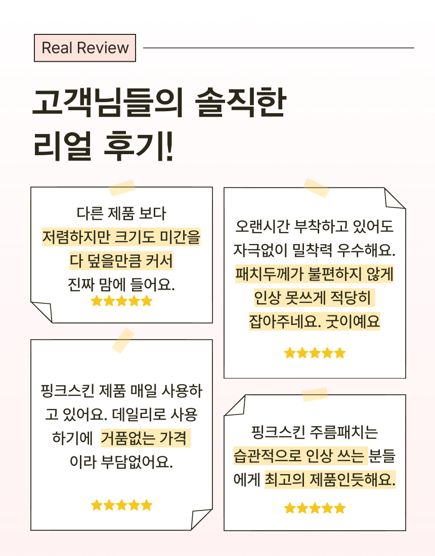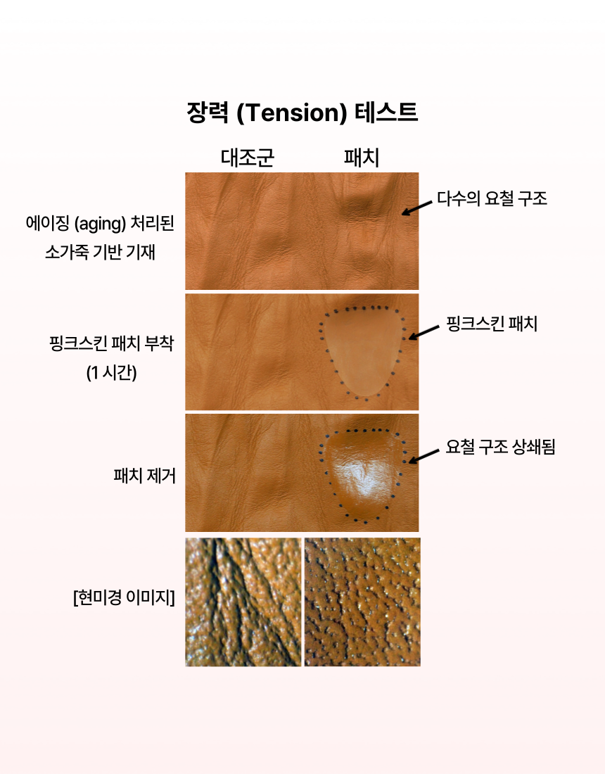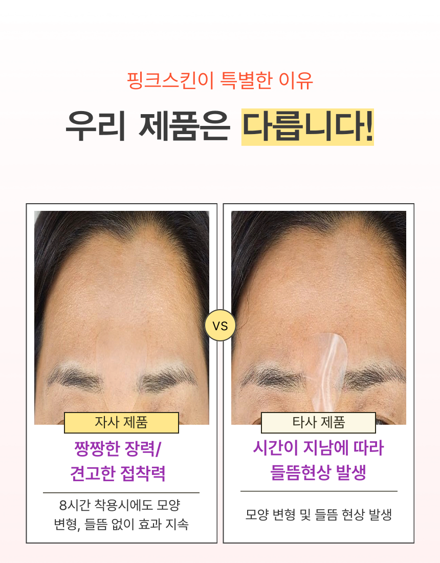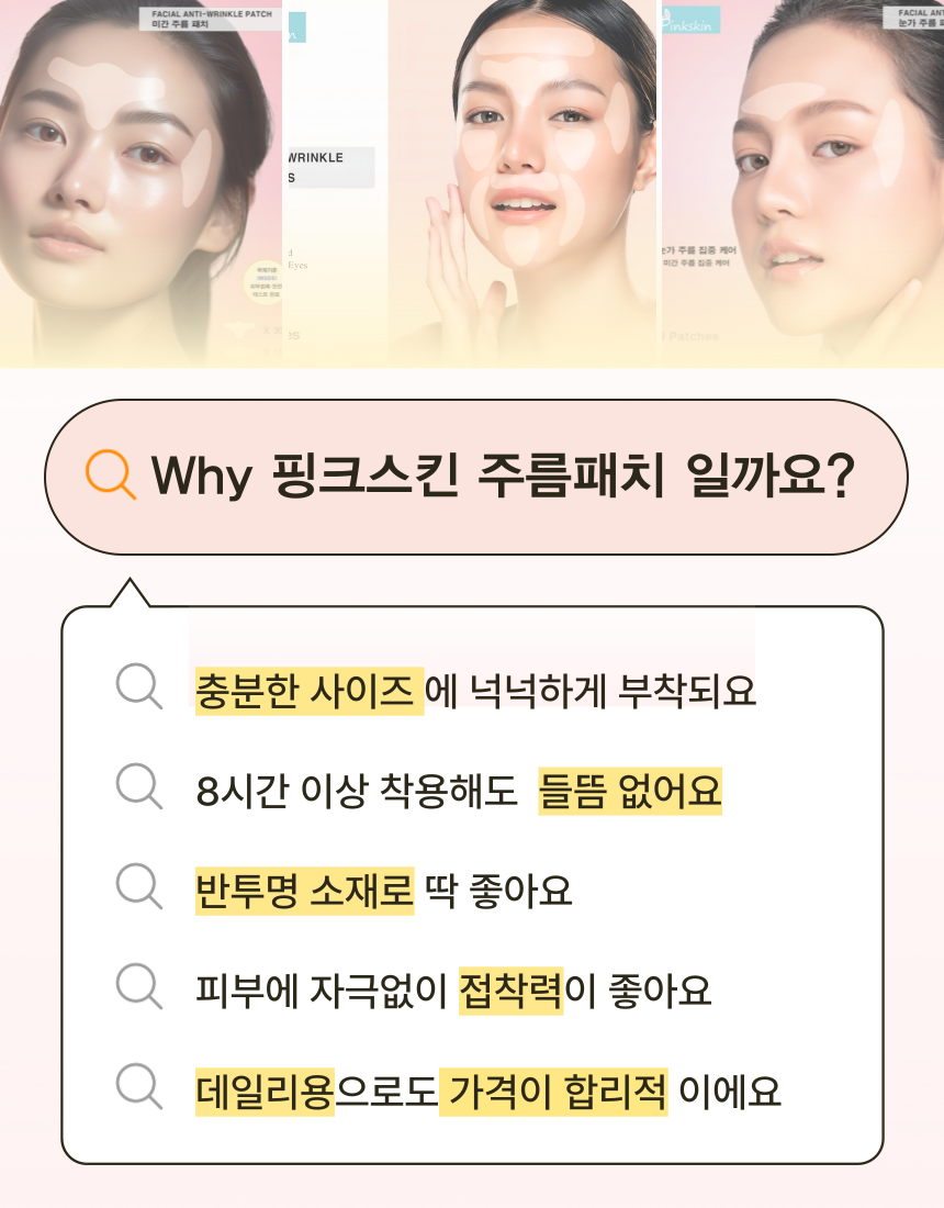 마침내 미간 전체를 커버 할수 있을 만큼 폭 및 길이를 증가시키더라도 장력과 접착력을 최적으로 발휘할 수 잇는 주름 패치를 개발하게 되었습니다.