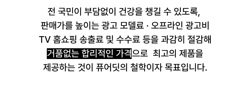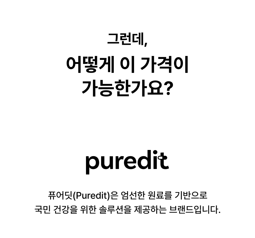 퓨어딧은 누구나 부담없이 건강을 챙길 수 있는 브랜드가 되고자 합니다. 화려한 광고 대신 좋은 원료와 정직한 제조, 합리적인 가격에 집중했습니다. 건강기능식품 본연의 순수 가치를 지키는 것이 퓨어딧의 철학입니다.