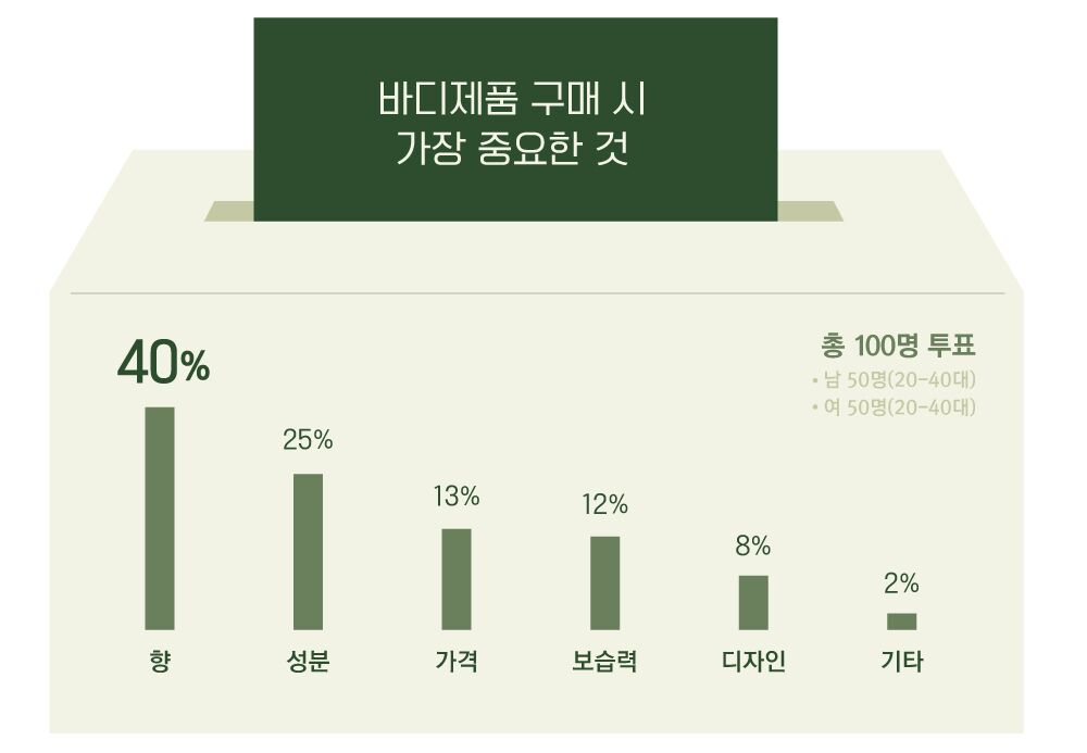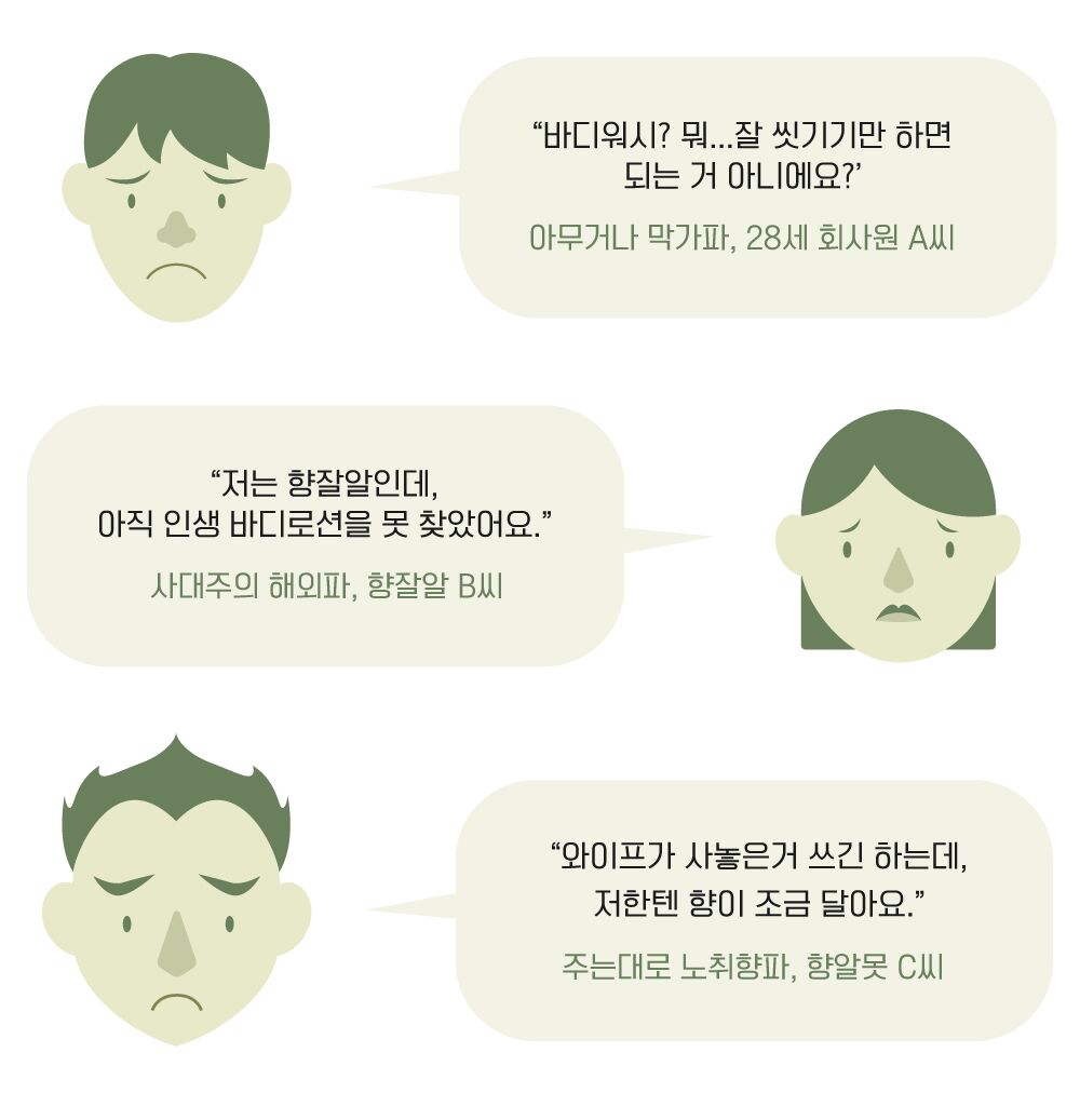 남녀 불문하고 누구나 한 번쯤은 드는 생각이죠. 우리는 담배 냄새를 가리기 위해 향수를 뿌리기도 하고, 집 안의 쾌적함을 위해 디퓨저를 놓기도 해요. 하지만 정작! 샤워할 때마다 직접 내 몸에 닿는 바디워시와 바디로션은  아무거나 쓰고 있지 않나요?