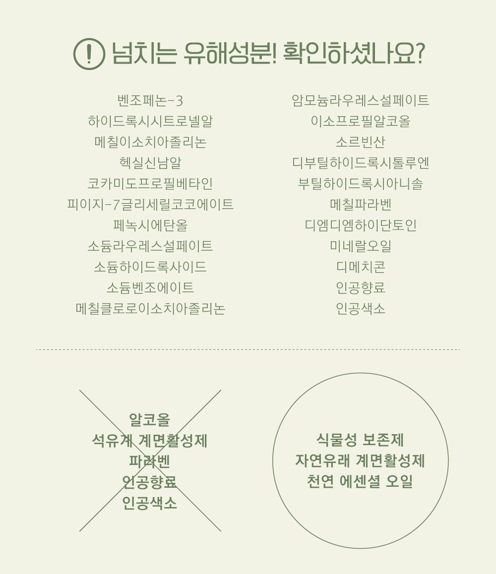 특히, 가습기 살균제로 잘 알려진 살균보존제 성분인 CMIT/MIT를 넣지 않았습니다.