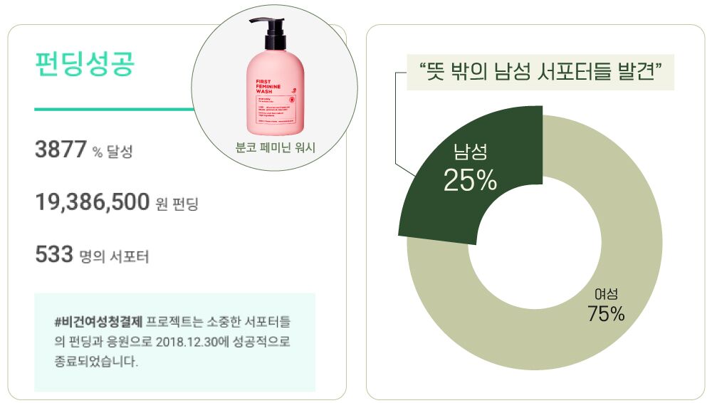 유난히 추웠던 지난 12월을 기억하시나요? 무려 3877%의 초과펀딩을 기록하며 펀딩에 성공한 분코의 ‘여성청결제'. 프리미엄 패밀리 케어 브랜드 분코의 여성청결제 제품은 여성분들의 폭발적인 성원과 함께, 남성분들도 많이 구매해 주셨는데요(무려 구매자의 25%!).
