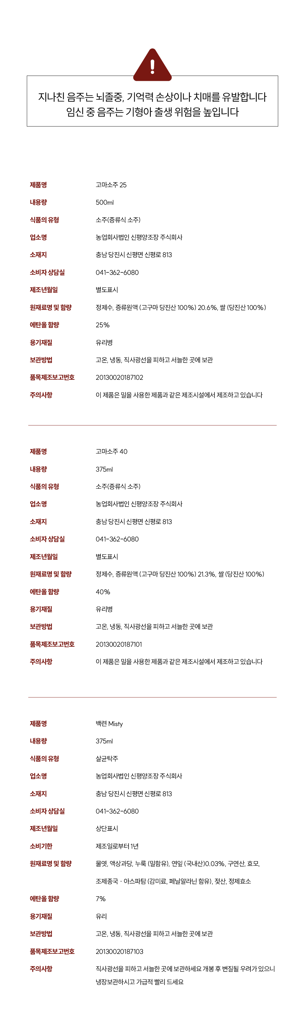 2025년에는 기존의 막걸리와 약주에 이어 증류주(소주 등)까지 출시하며 전통주 제품군을 확대하고 있습니다. 모든 제품은 100% 당진산 쌀과 고구마 등 지역 농산물을 원료로 사용하고 있습니다.