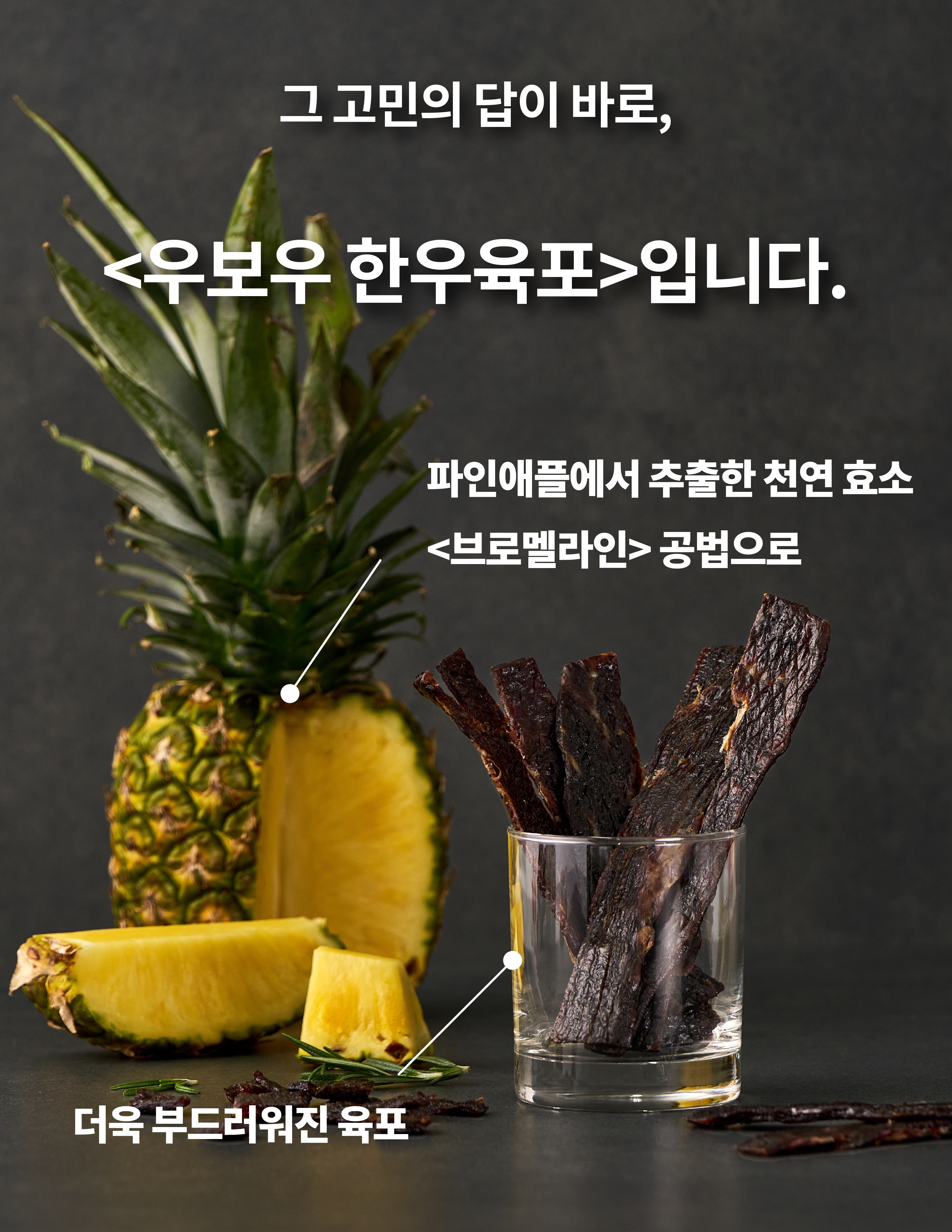 특히 예천의 지역 정체성을 담아내고 싶었습니다. 참깻묵을 먹여 키운 예천 한우, 무항생제 한돈, 그리고, 브로멜라인 천연효소를 활용한 연구. 이렇게 축적된 경험과 기술이 모여 이번에 선보이는 우보우 프리미엄 육포가 탄생했습니다.