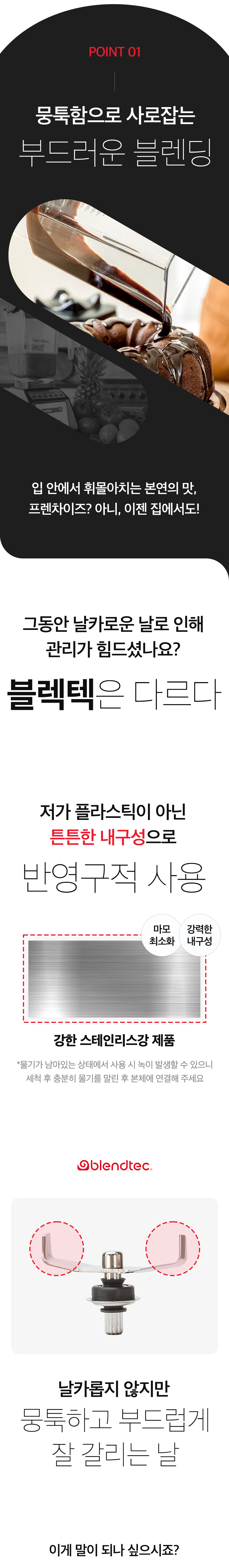 블렌텍의 블레이드는 날카롭지 않은 뭉툭한 날로, 더 빠르고 부드럽게 블렌딩 가능합니다.