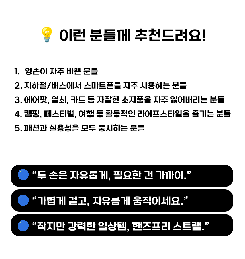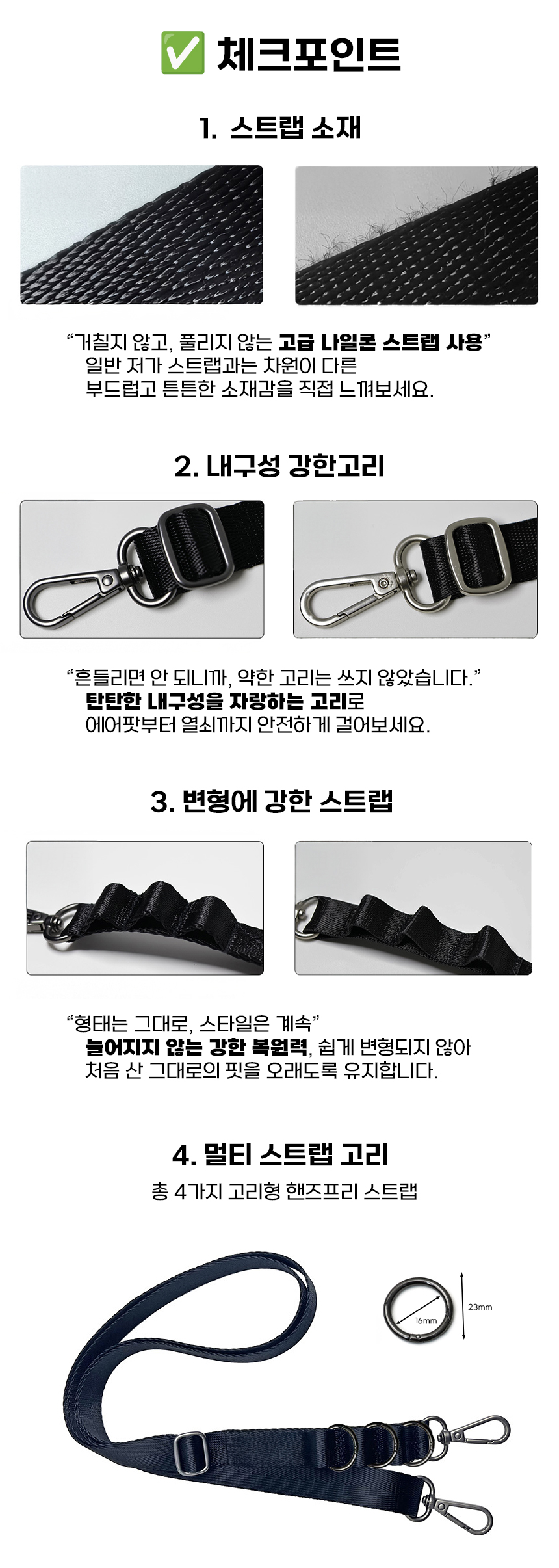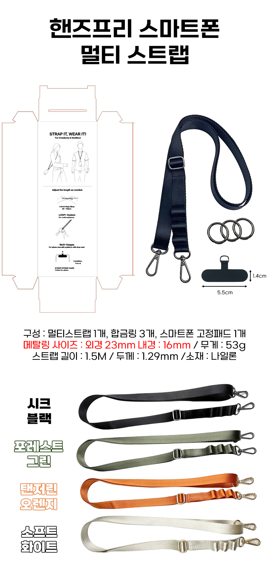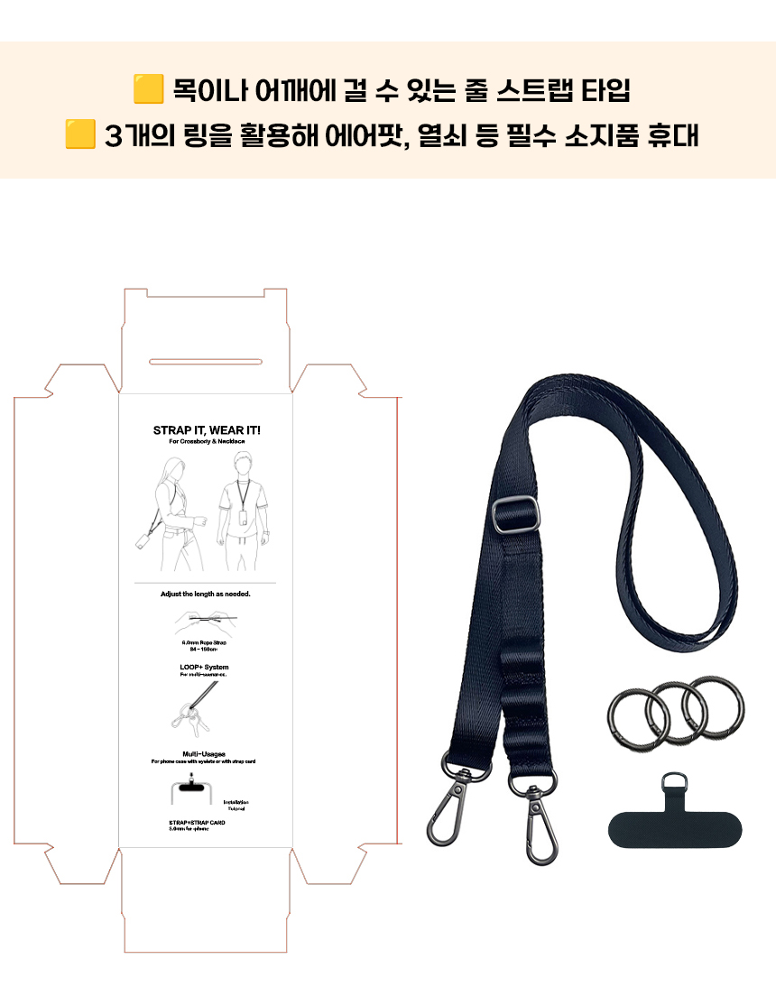 요즘 사람들은 미니멀하고 심플한 라이프스타일을 추구합니다. 지갑도 카드 하나로, 가방도 가볍게. 이런 트렌드에 맞는 아이템으로 작지만 확실히 편리한 멀티 스트랩 하나면 스마트폰, 카드, 열쇠까지 모두 해결할 수 있습니다. 일상을 더 간편하게 바꾸는 작은 시작, 스트랩은 단순한 줄이 아닙니다. 코디의 포인트가 될 수 있고, 기능성 아이템이 될 수도 있죠. 그래서 스타일은 물론 내구성과 실용성까지 갖춘 스마트한 스트랩을 런칭하게 되었습니다.