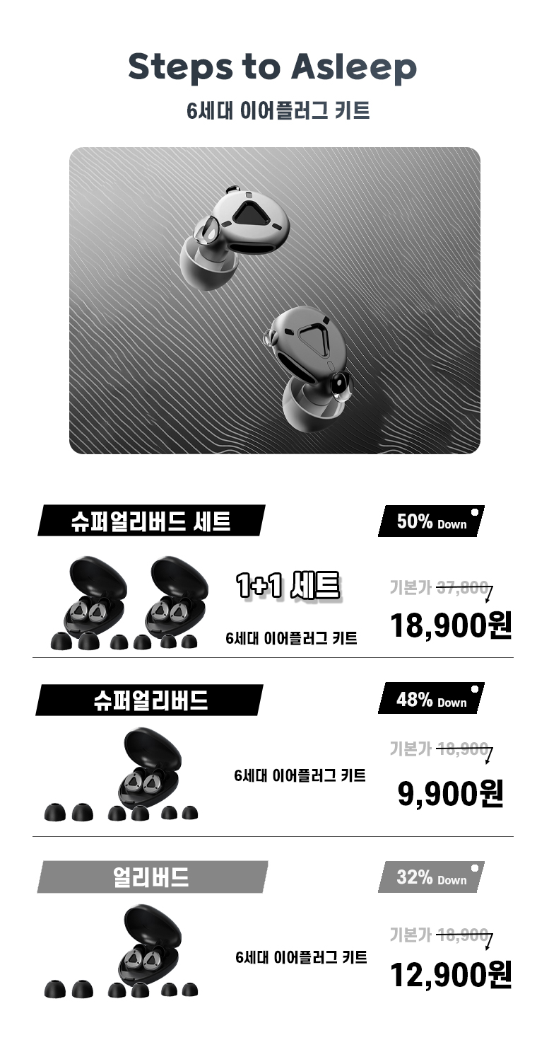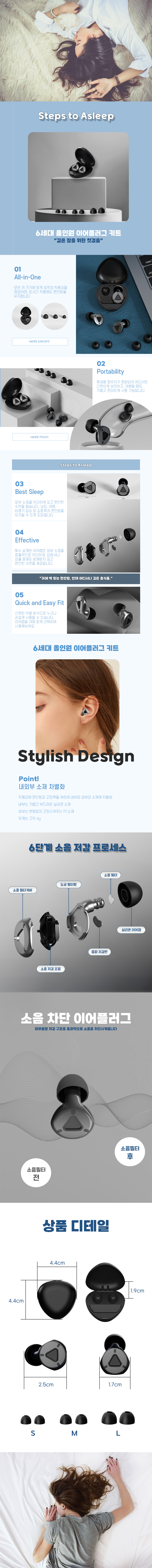 현대인의 바쁜 생활 속에서 어디서든 편안한 수면 환경을 제공할 수 있는 휴대용 이어플러그는 매우 유용합니다. 비행기나 기차 등 이동 중에도, 또는 야간에 소음이 많은 환경에서도 편리하게 사용할 수 있습니다. 기존 이어플러그의 단점인 휴대성과 다양한 이어캡이 없는 부분, 그리고 눈에 뛰는 주황색이 미관상 이쁘지 않다는 점을 고려하여 여러 단점을 보완한 6세대 이어플러그를 런칭하게 되었습니다.