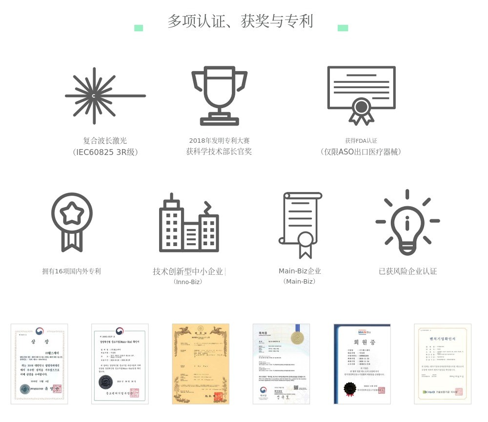 通过两家医院临床资料验证650nm & 830nm双波长冷激光 大型冷激光器 医疗器械的小型化及可穿戴冷激光设备的商业化 拥有12项国内外注册/申请专利,荣获18年科技部部长奖