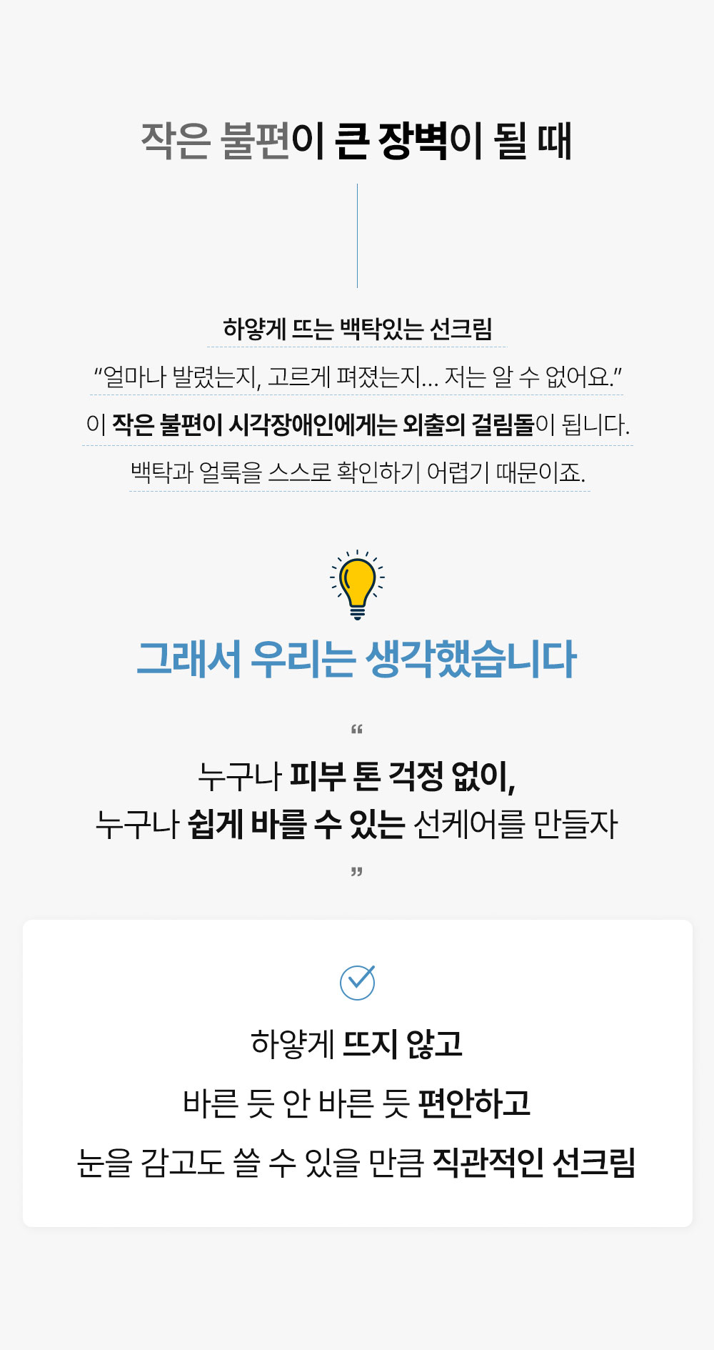 라이트글로우 선세럼은 시각장애인분들도 백탁 걱정 없이 사용할 수 있도록 개발된