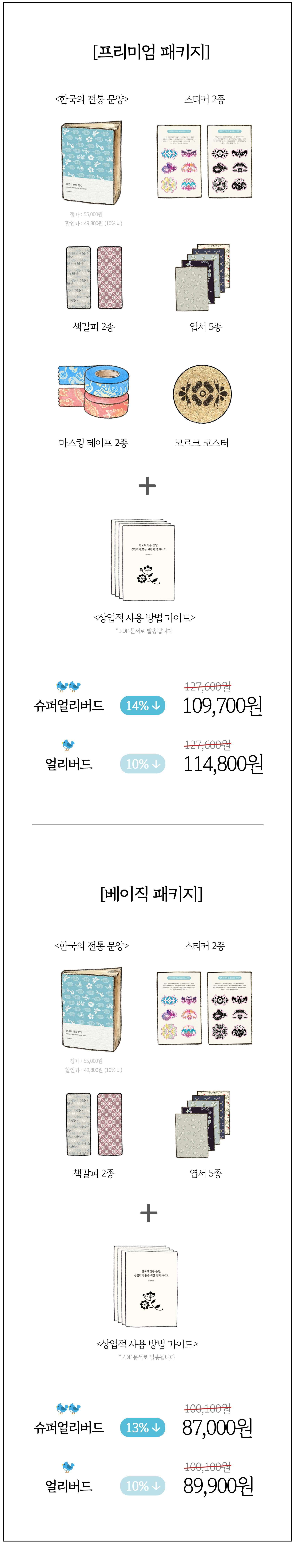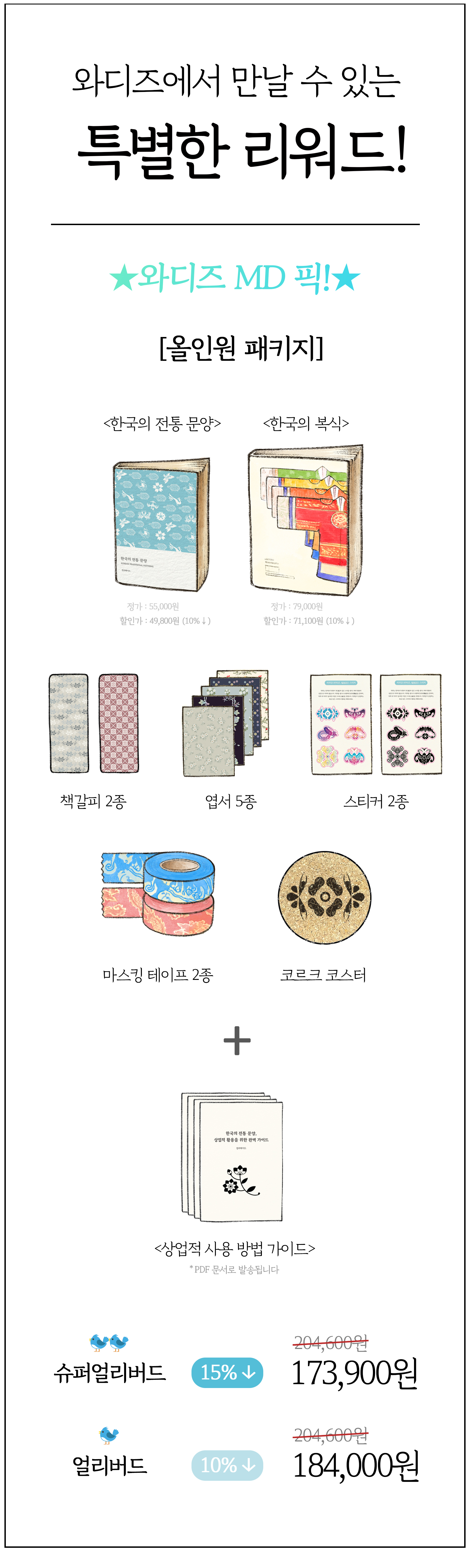 한국의 아름다운 전통 문양들이 한가득 들어있는 풀컬러 도록, 그리고 다양한 보너스 리워드.