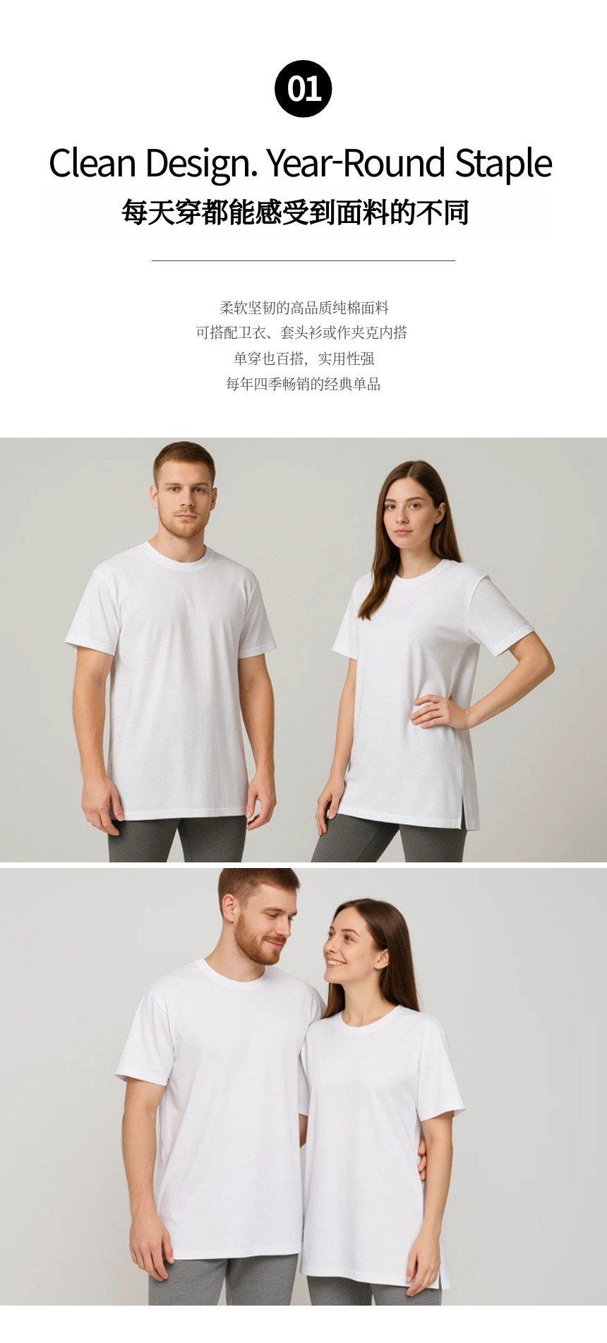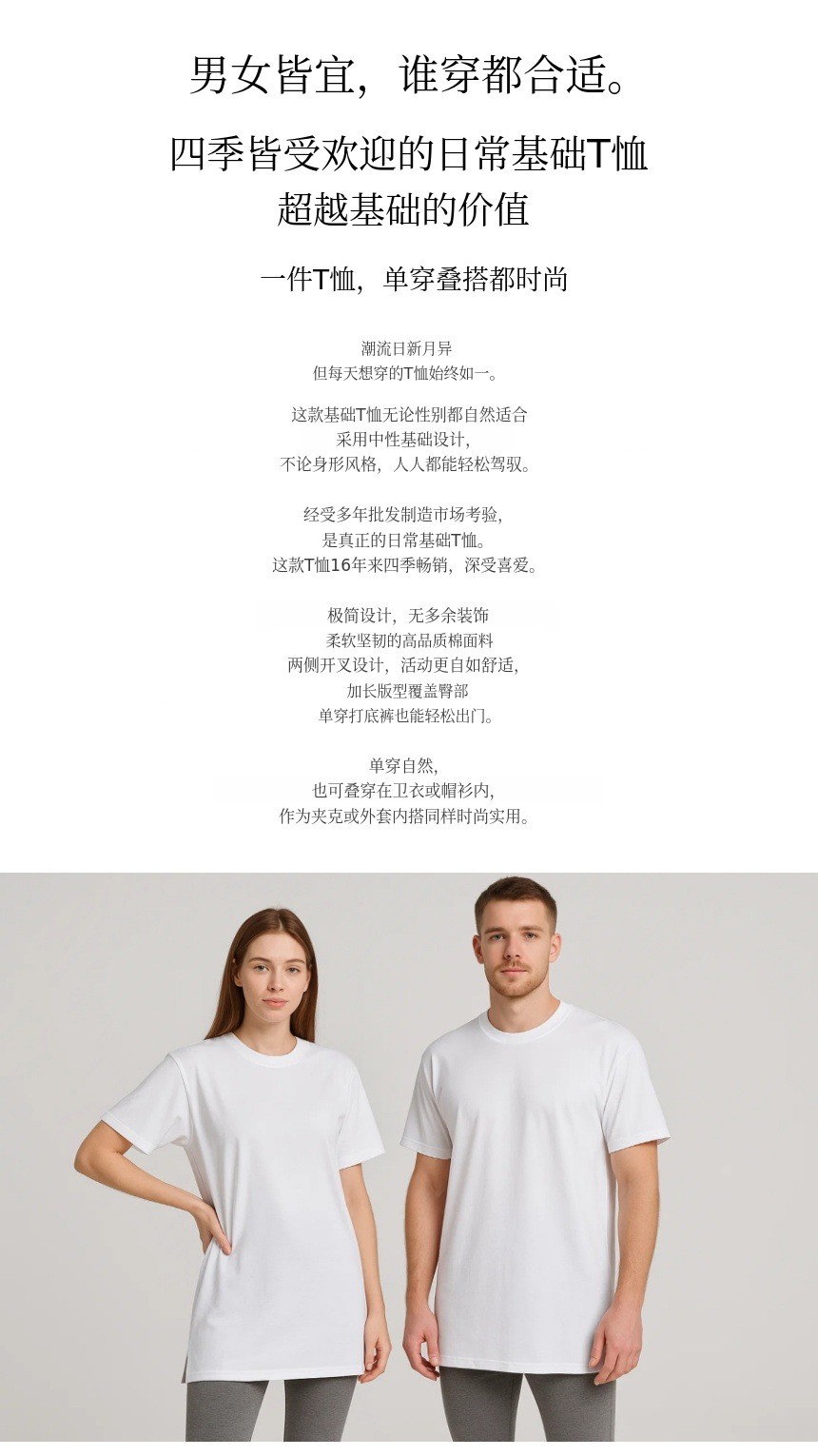 1. 👕 优质棉基础T恤 - 16年畅销,男女皆宜舒适设计 2. ✨ 完美剪裁与风格 - 侧开衩设计,单穿与叠穿皆适合 3. 🎁 WADIZ限量特价 - 无流通利润的直接销售