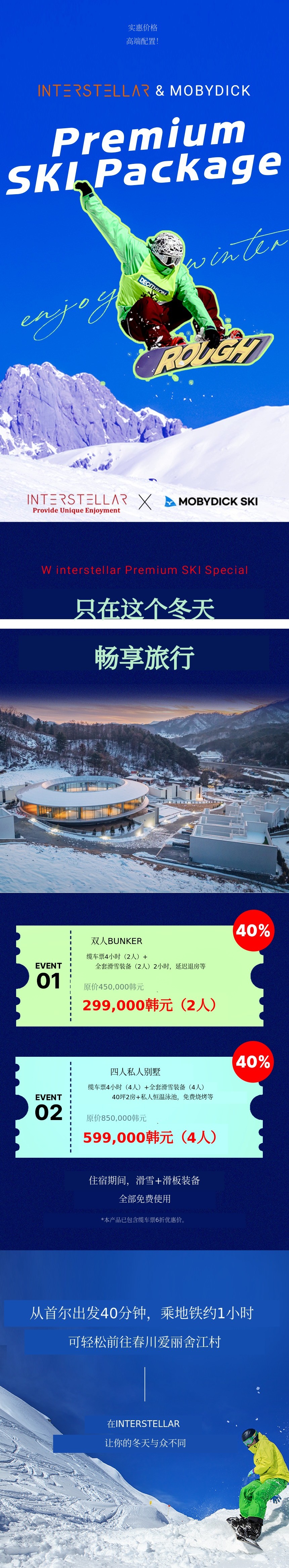 高端结合:可以一次性体验经过验证的Elysian雪道、配备顶级设备的高端滑雪店,以及保障完全休息的高端泳池别墅。