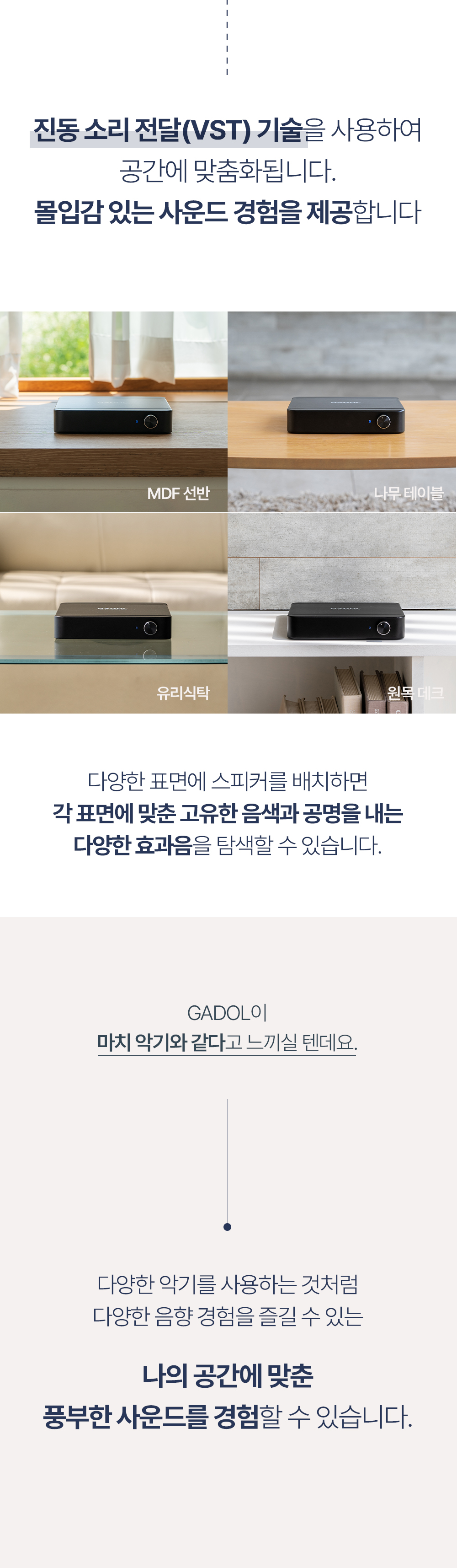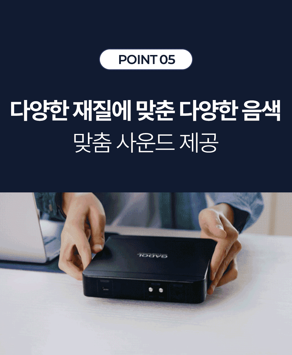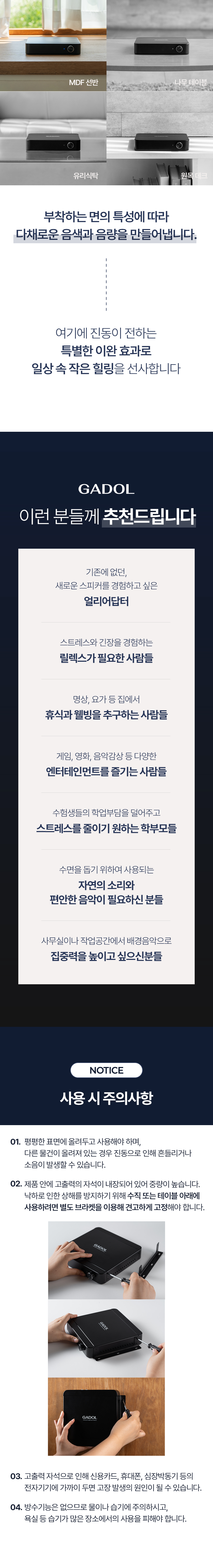 1. 🔊 GADOL振动扬声器 - 将空间转变为声音艺术品的次世代振动扬声器 2. 🎵 舒适的声音体验 - 根据空间特性提供沉浸且稳定的声音 3. 🎁 限时折扣优惠 - 1+1套装及单品限量优惠销售