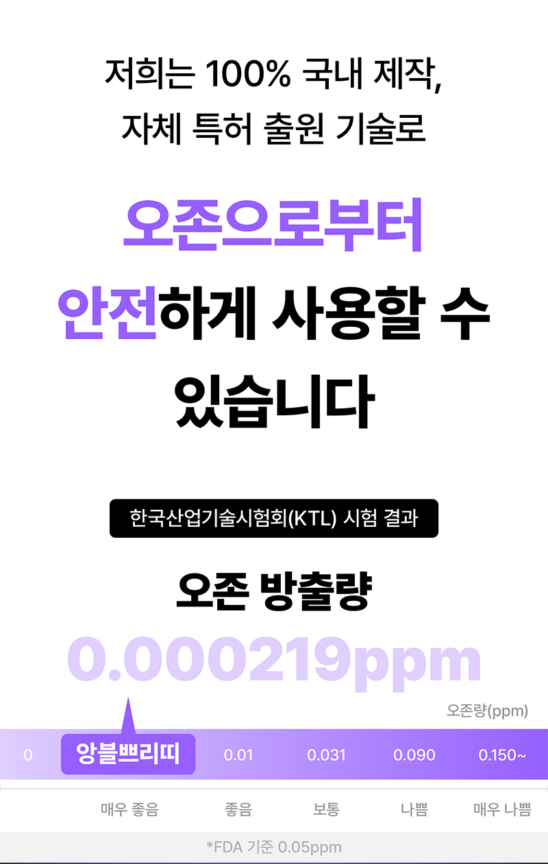 A. 코에 가까이 사용할 경우에는 미세한 오존 냄새가 올라올 수 있으나, 인체에 무해합니다. 오존 방출량 국제 기준 이하로 엄격히 통제하였으므로 안심하고 사용하셔도 좋습니다.