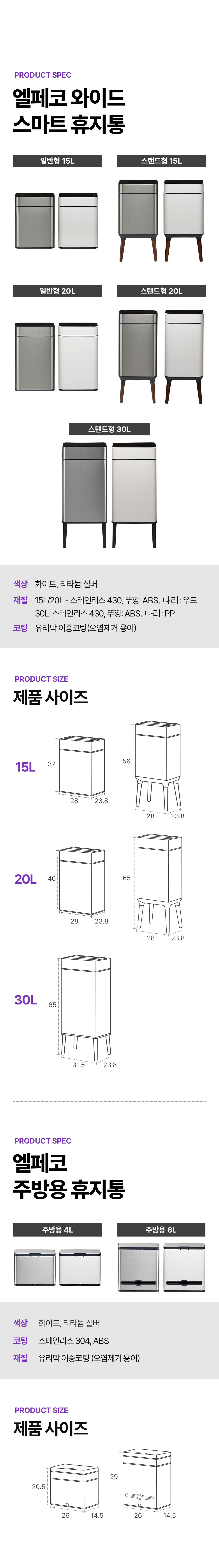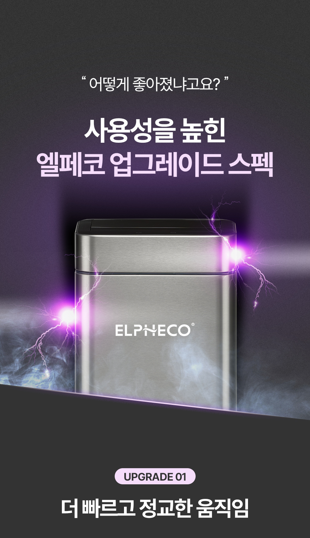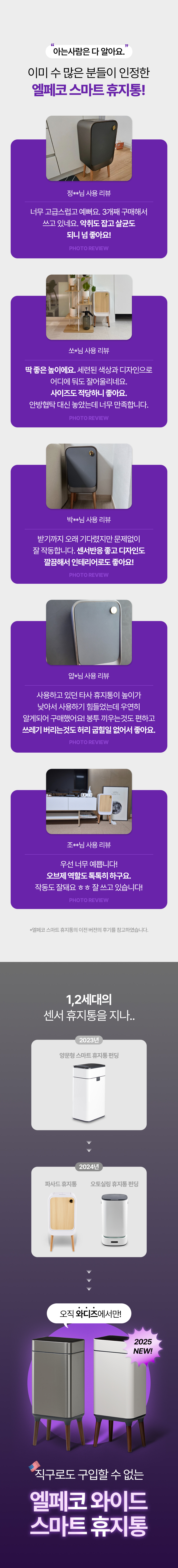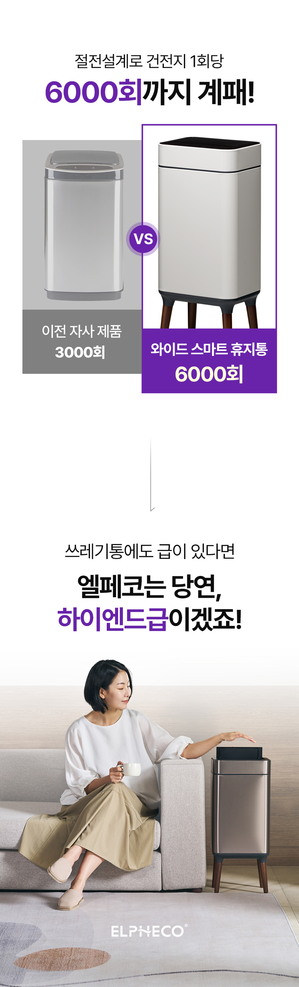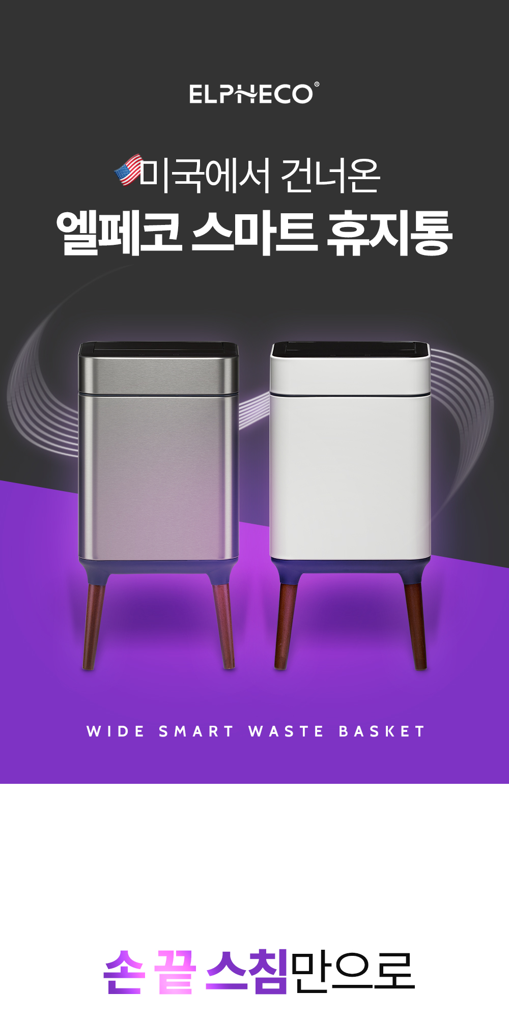 이번에 소개하는 엘페코 와이드 스마트 휴지통은 LED 작동 표시등 도입은 물론 종전에 사용하던 모터를 정밀 제어가 가능한 스텝핑 모터로 업그레이드 하여 사용감, 내구성, 소음 등을 월등히 개선한 최고의 제품이라 약속드립니다.