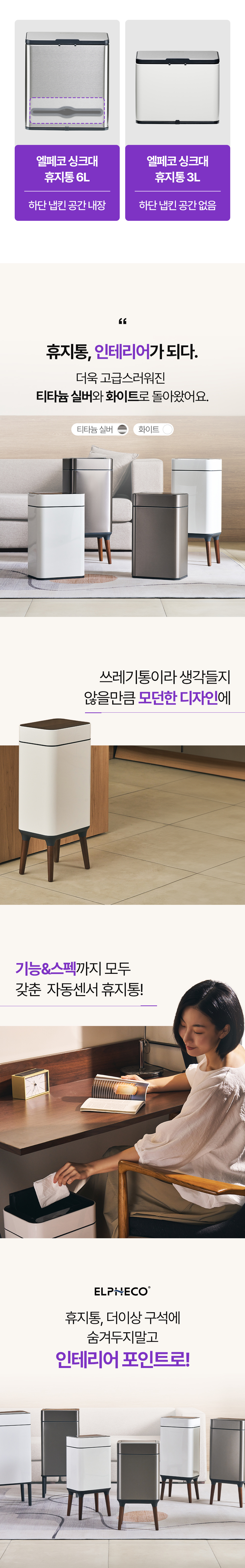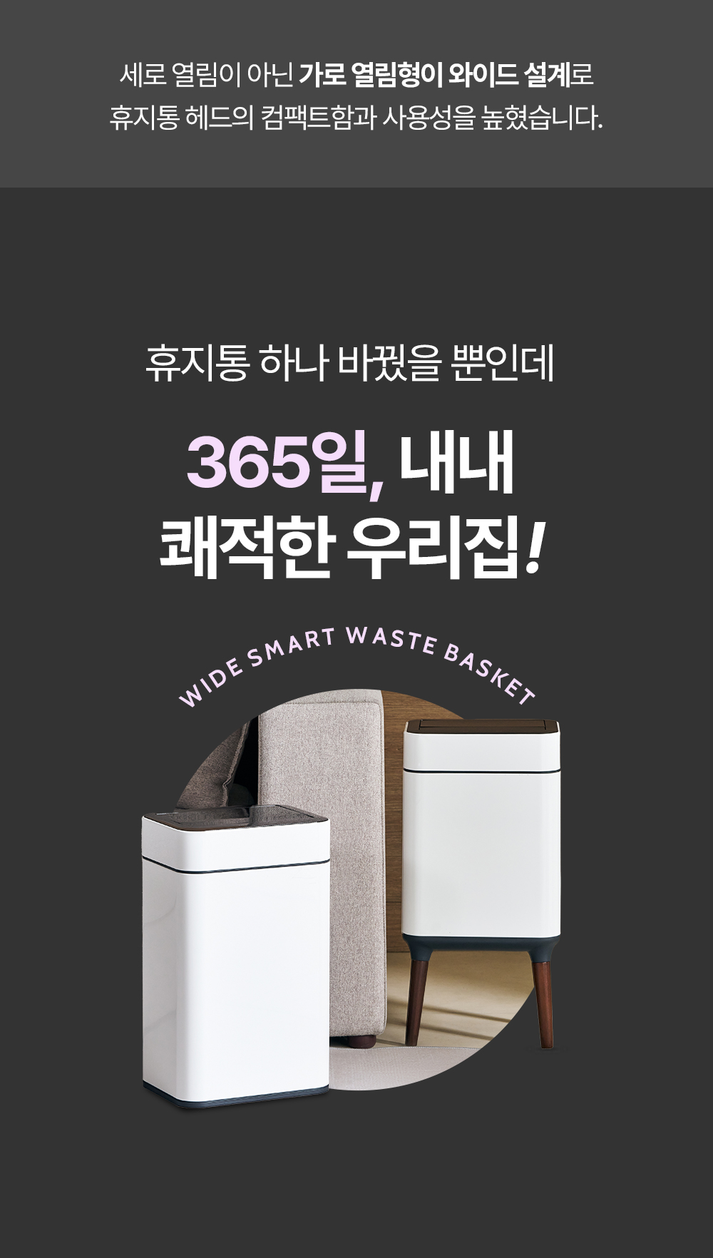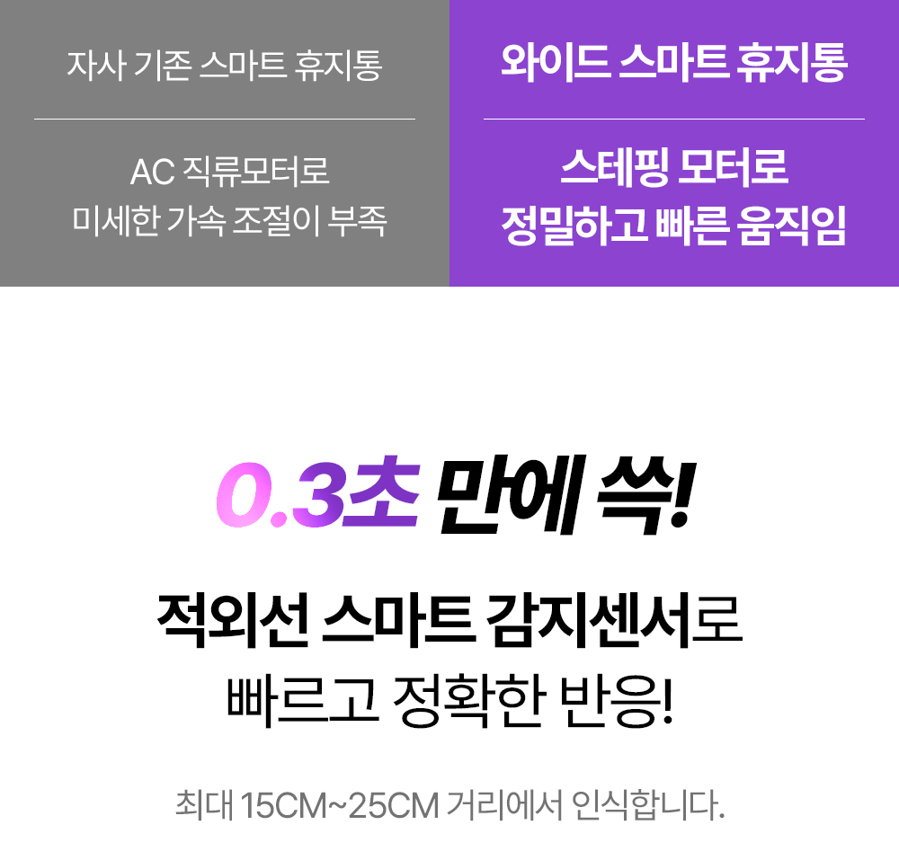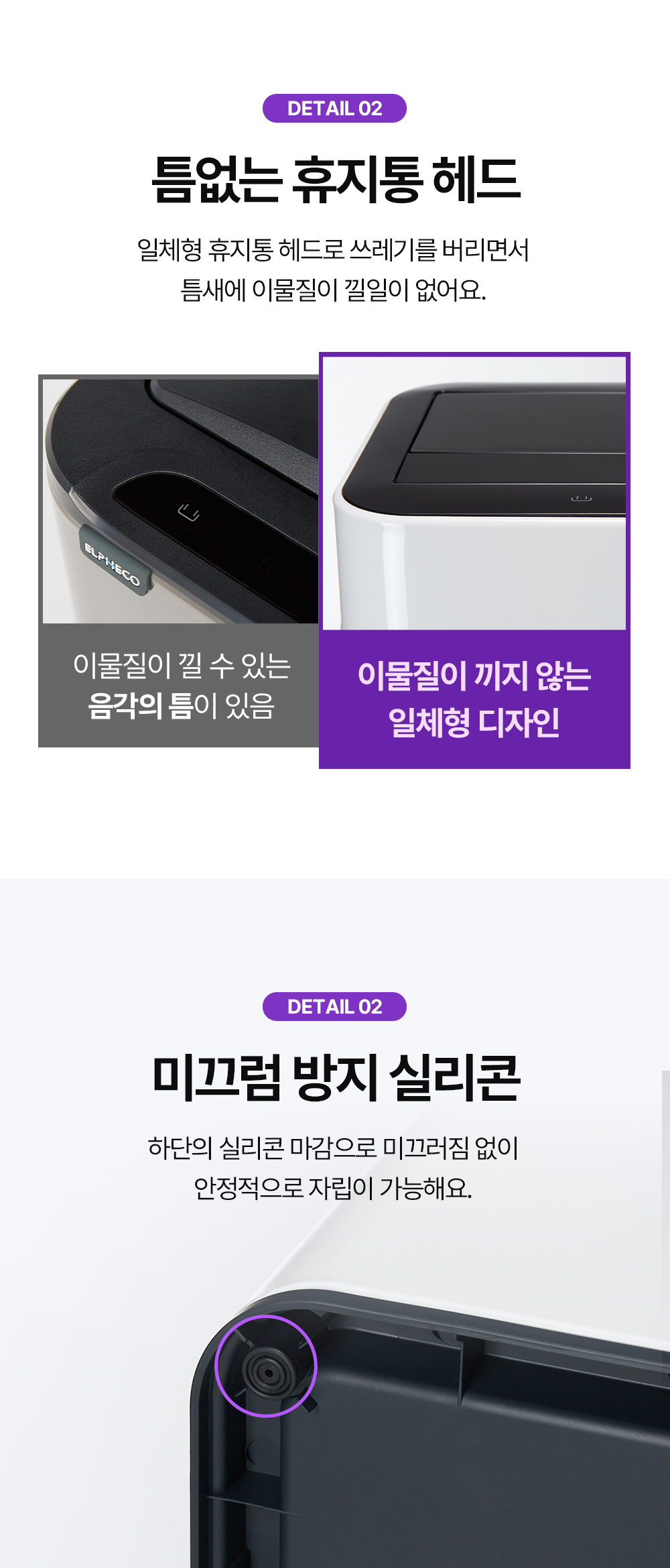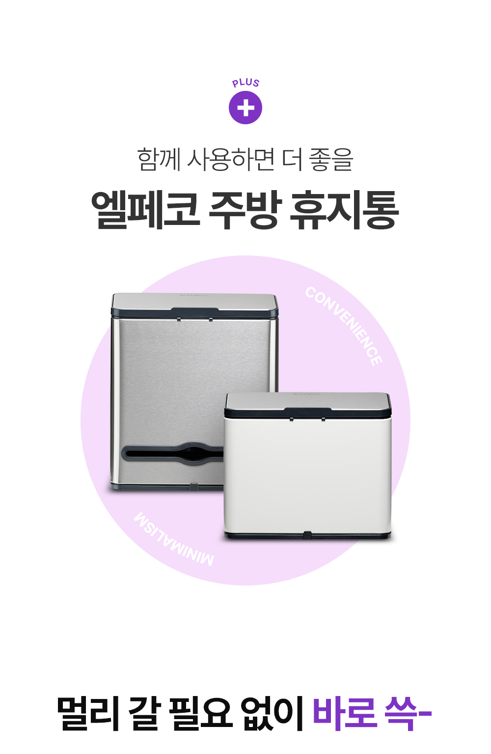 이번에 소개하는 엘페코 와이드 스마트 휴지통은 LED 작동 표시등 도입은 물론 종전에 사용하던 모터를 정밀 제어가 가능한 스텝핑 모터로 업그레이드 하여 사용감, 내구성, 소음 등을 월등히 개선한 최고의 제품이라 약속드립니다.