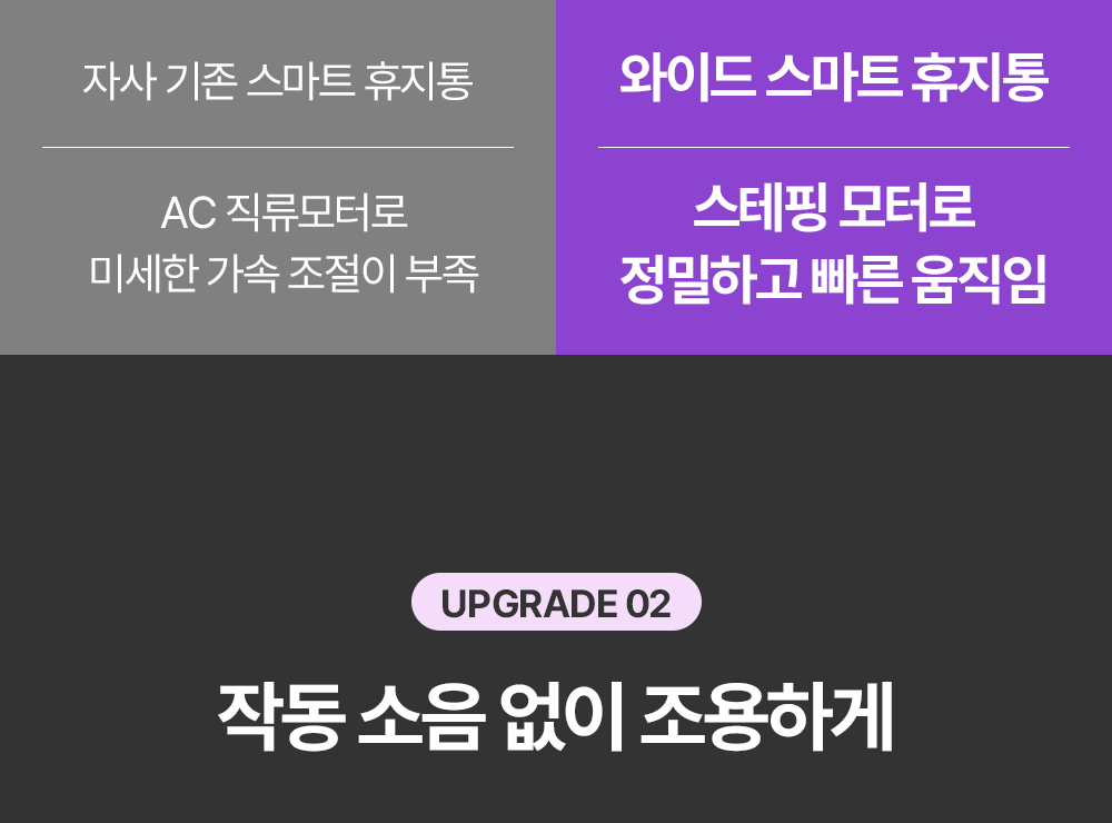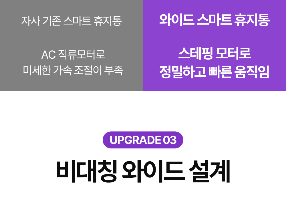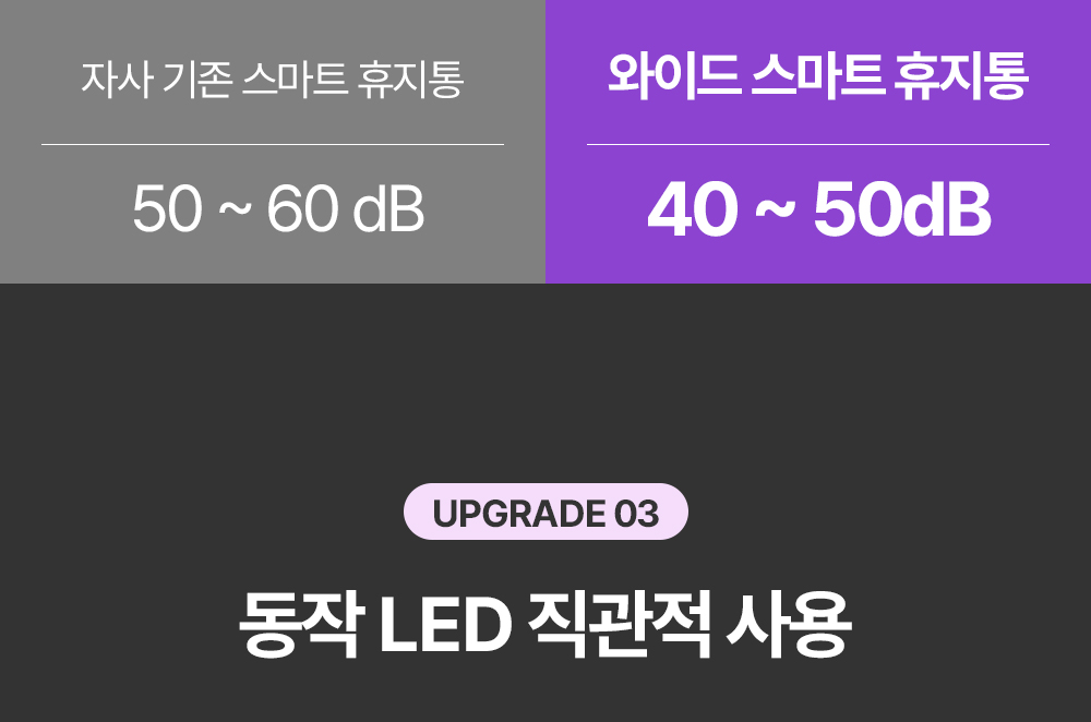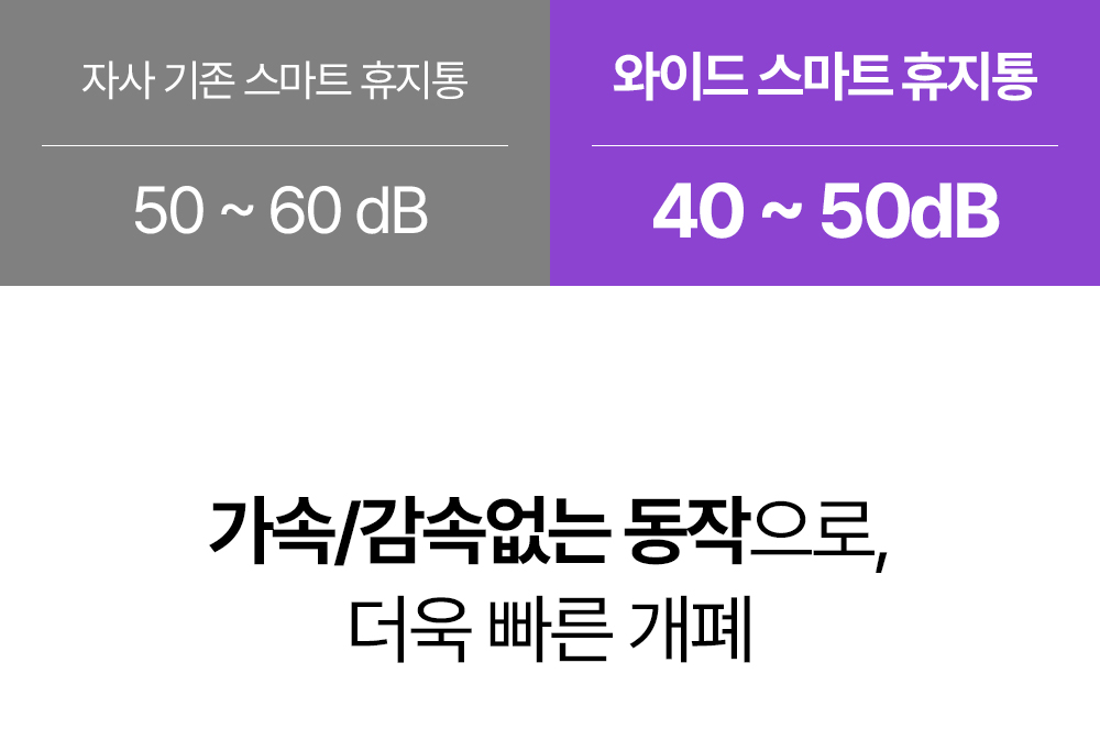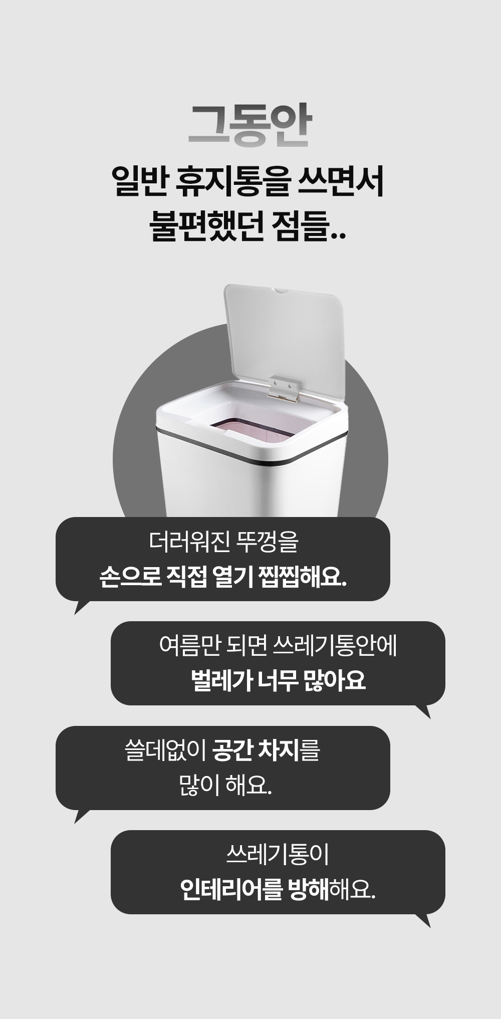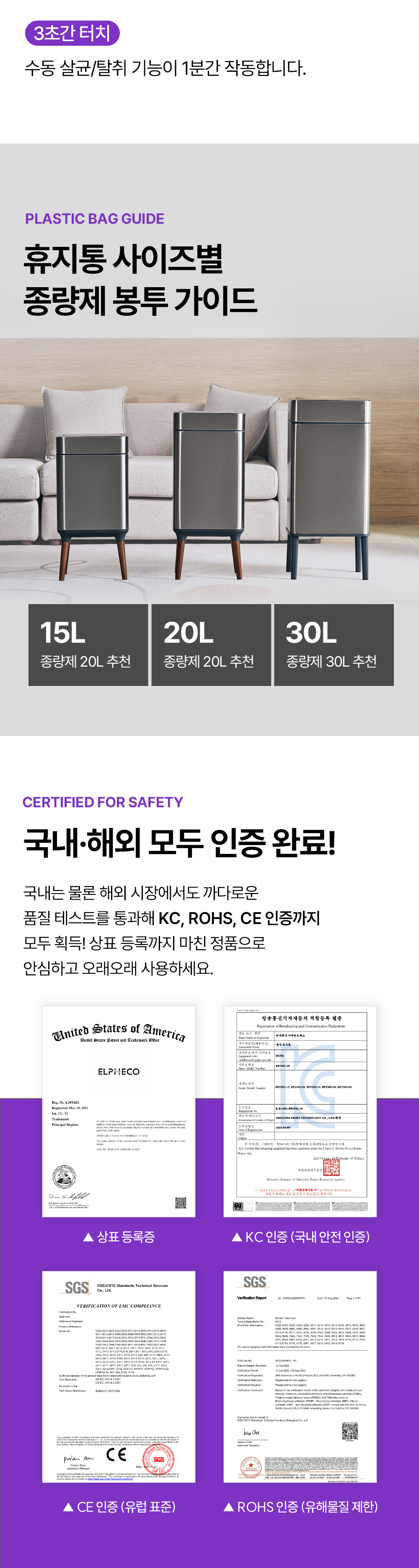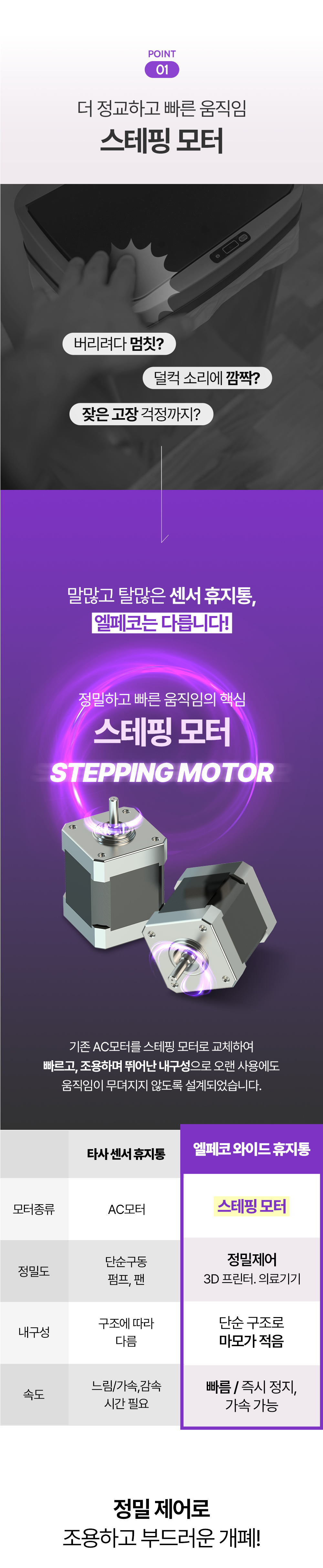 이번에 소개하는 엘페코 와이드 스마트 휴지통은 LED 작동 표시등 도입은 물론 종전에 사용하던 모터를 정밀 제어가 가능한 스텝핑 모터로 업그레이드 하여 사용감, 내구성, 소음 등을 월등히 개선한 최고의 제품이라 약속드립니다.