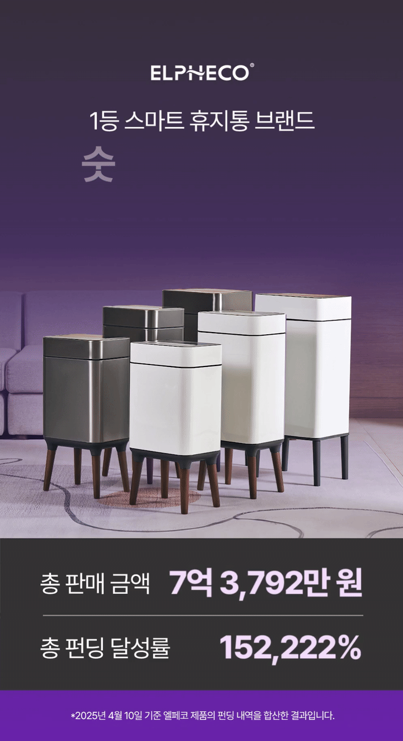미국 엘페코 스마트 휴지통 브랜드를 처음 와디즈에 소개한 후 엘페코 파사드 휴지통, 엘페코 오토실링 휴지통 등 많은 브랜드 제품의 펀딩을 진행하고 있습니다.