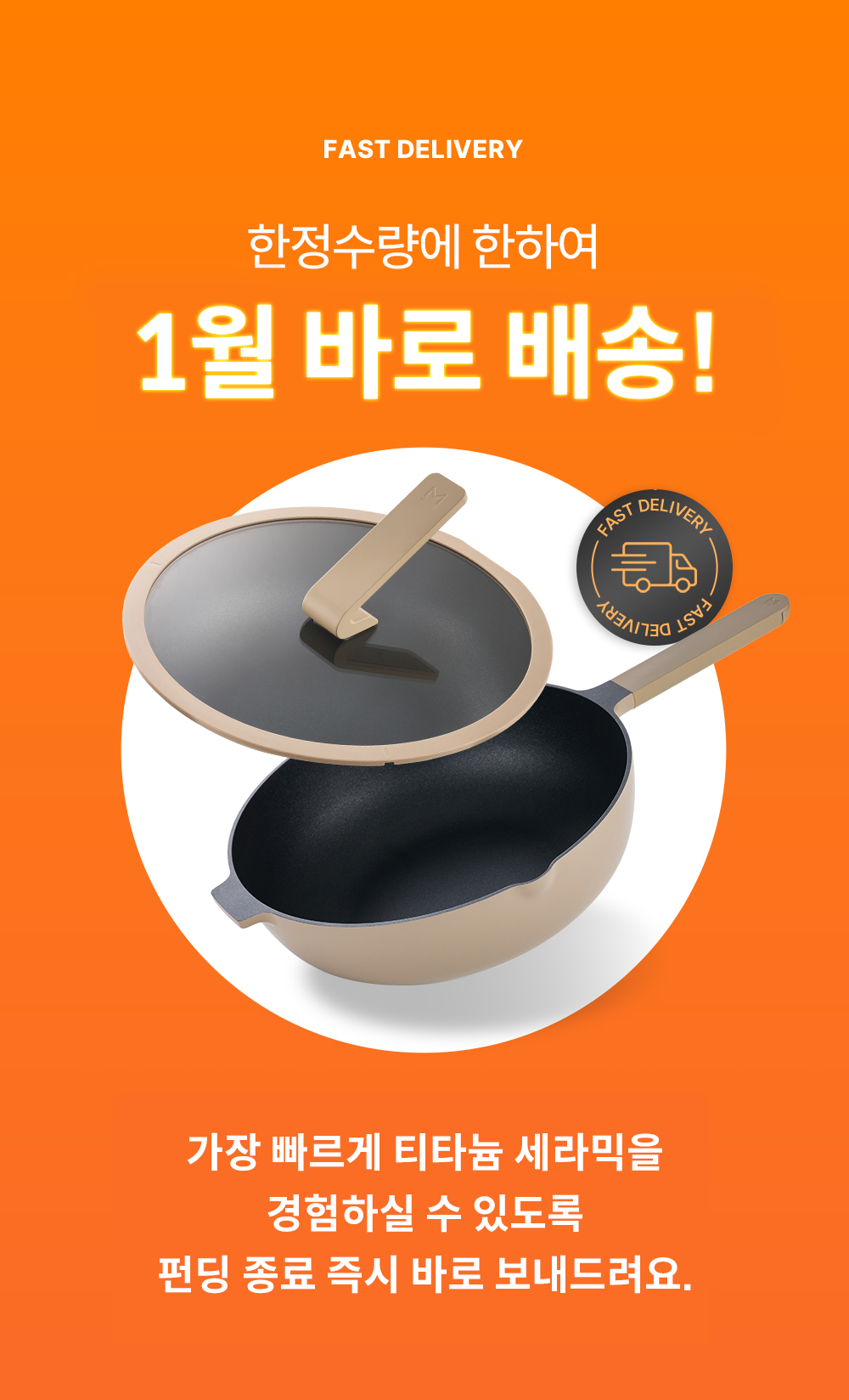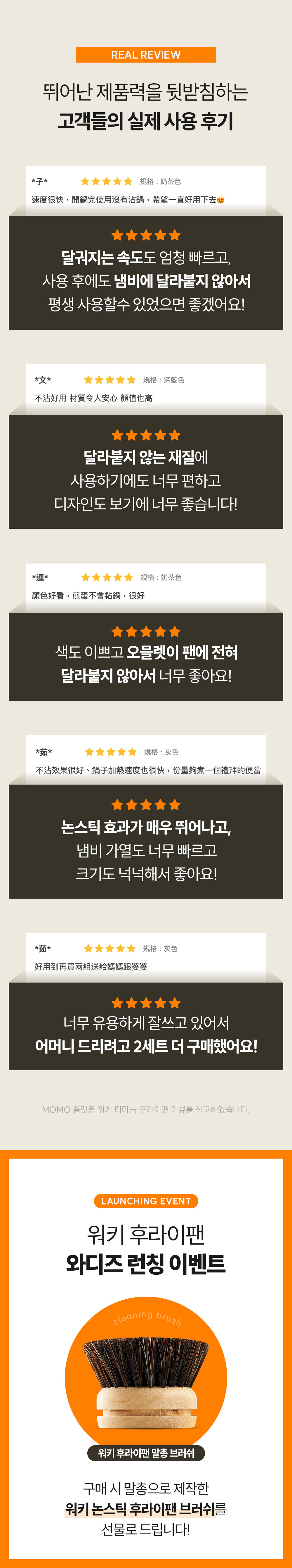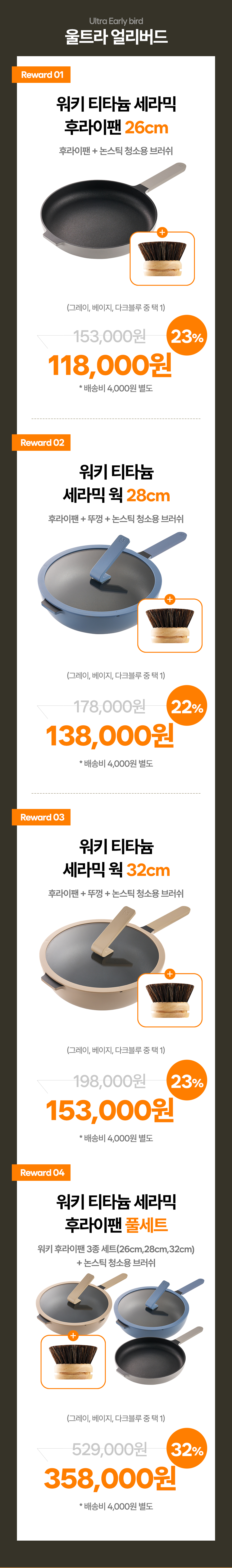 저희는 와디즈를 통해 워키 브랜드 신제품을 최초로 공개하며 티타늄 세라믹 프라이팬을 만나시는 서포터님들께 가장 합리적인 가격혜택과 구성으로 상품을 제공할 것을 약속 드립니다.