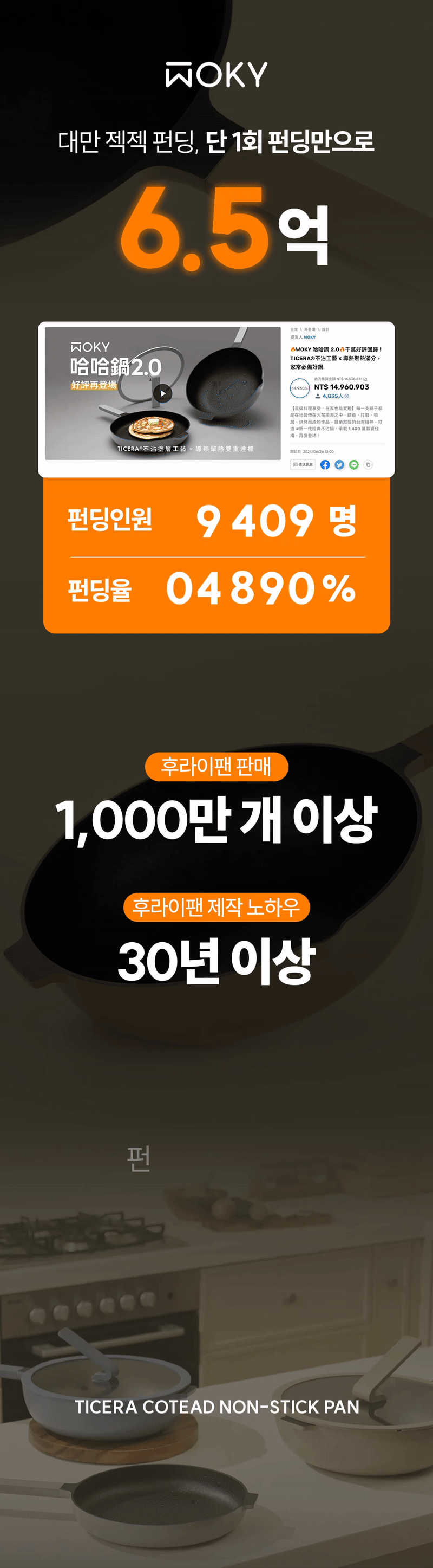 워키 티타늄 세라믹후라이팬은 2024년 대만 펀딩 시 목표달성 7억의 큰 성공을 걷은 획기적인 제품입니다.