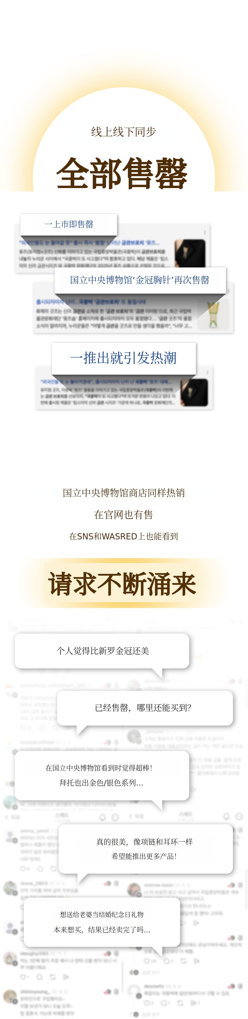 由于新罗金冠胸针作为国立中央博物馆官方周边商品推出后受到了极大关注和支持,许多顾客请求制作银质、金质材质的项链和耳环等珠宝系列。