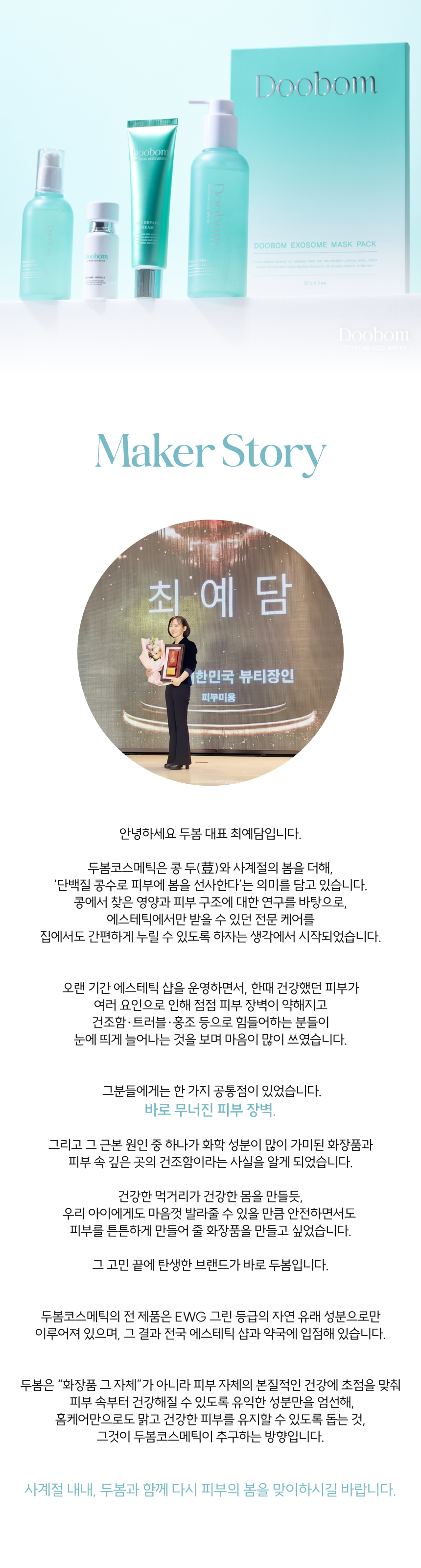 긴글을 읽어주셔서 감사합니다. 두봄은 항상 좋은 성분과 원료들로 고객님들을 생각하며 더 좋은 화장품을 만들어 나가겠습니다.