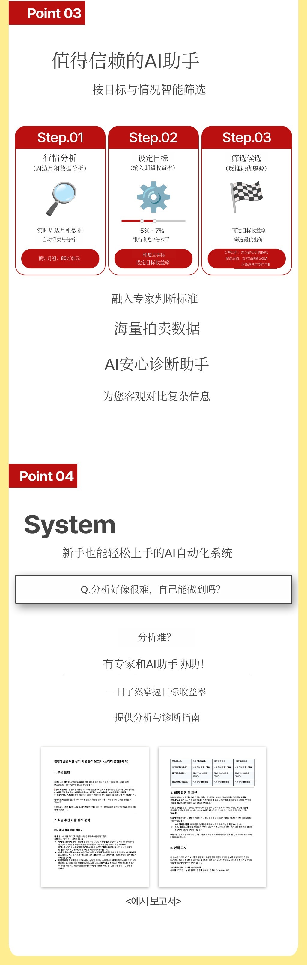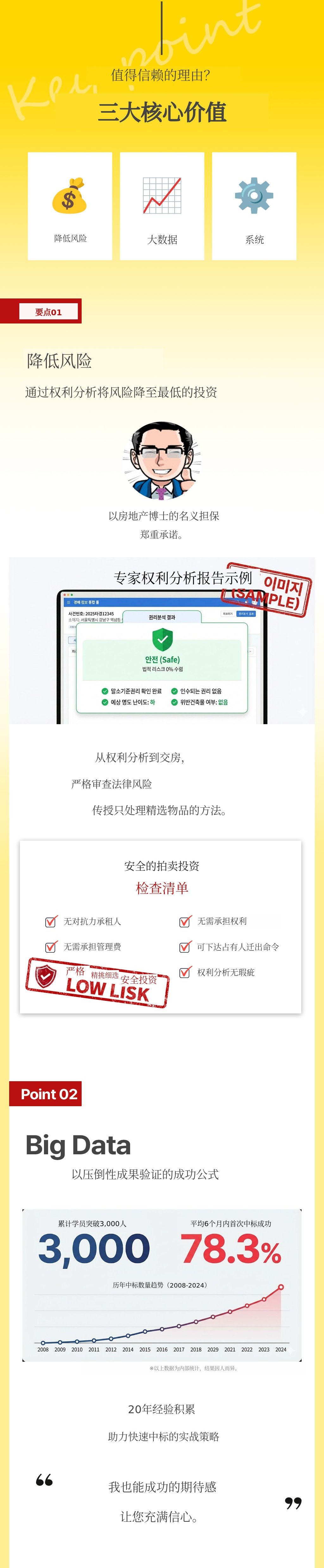 为了解决这种信息不对称,我准备了集结我20年经验和最新技术的项目。筹集的资金将全部用于制作高质量的教育内容(VOD及电子书),让更多人能以小额资金安全守护资产,'AI拍卖安心诊断助手' 系统的高度化。