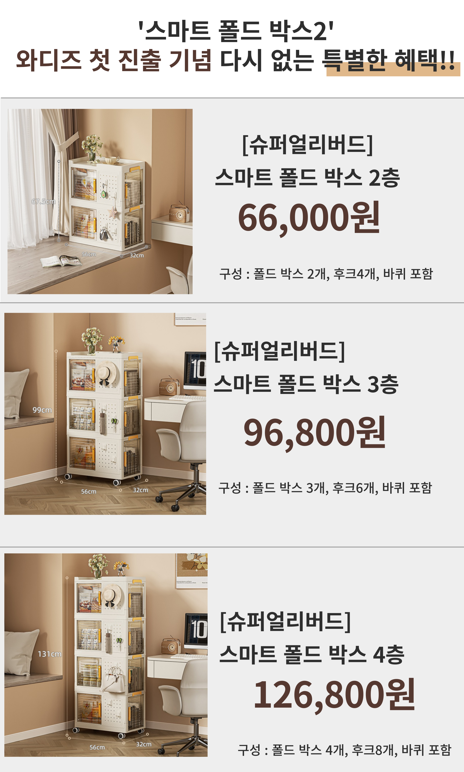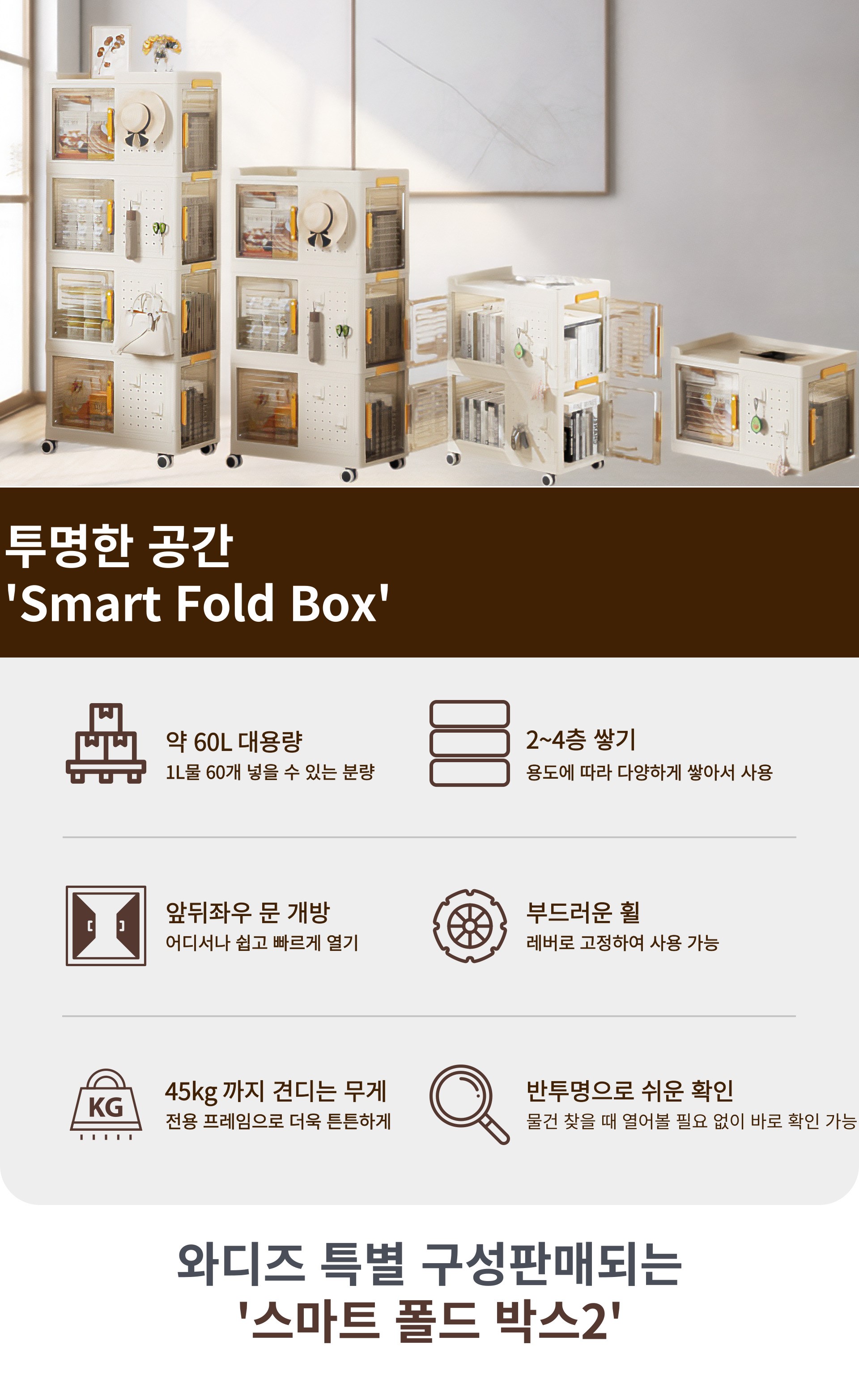 1. 📦 三层透明折叠收纳箱 - 折叠堆叠节省空间,整洁收纳 2. 🔍 透明窗便于查看内部 - 半透明门设计,快速确认物品 3. 🎁 限量特别套装 - Wadiz独家,多层及配件组合