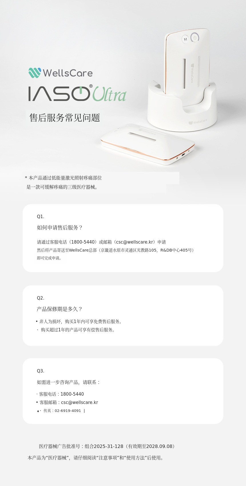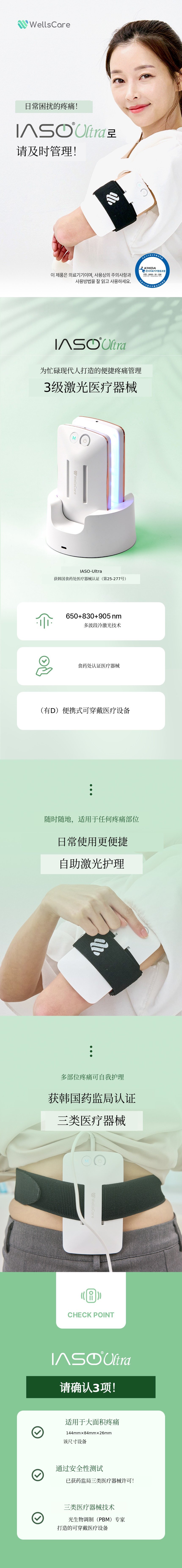 (株)WellsCare是一家成立于2018年的光生物调制康复治疗专业医疗器械企业,将北美最新的康复治疗技术——冷激光技术应用于可穿戴冷激光自我止痛治疗器IASO,并实现了商业化。公司以北美市场为中心开展业务,是韩国医疗器械企业中首家进入美国亚马逊、BestBuy、沃尔玛等平台进行销售的企业。
