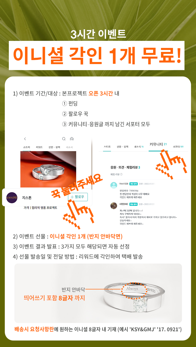 A. 이번 반지의 특성상 제작완료후 사이즈 변경작업은 불가합니다. 새로 제작하여 교환/발송을 해드려야 하는데요, 이럴 경우 기본공임(5만원)+배송비가 발생됩니다. 때문에 꼭 정확한 사이즈를 확인하시고 펀딩 부탁드립니다.