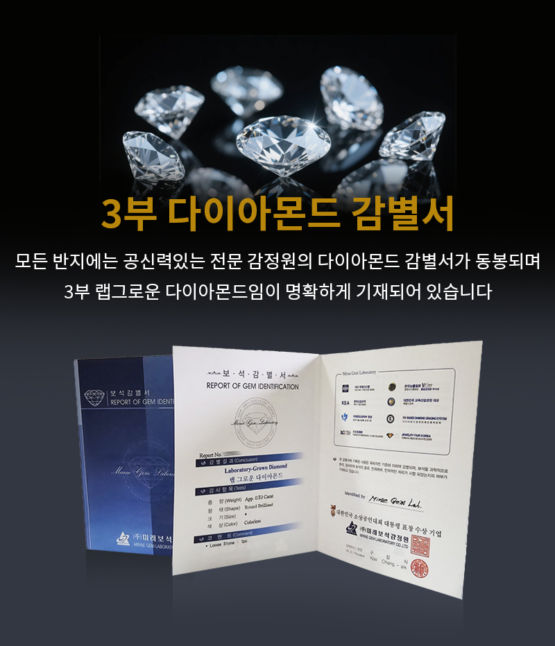 형태와 광채만 따라만든 시뮬럿/모이사나이트와는 태생부터 다르며 세계적으로 가장 공신력있는